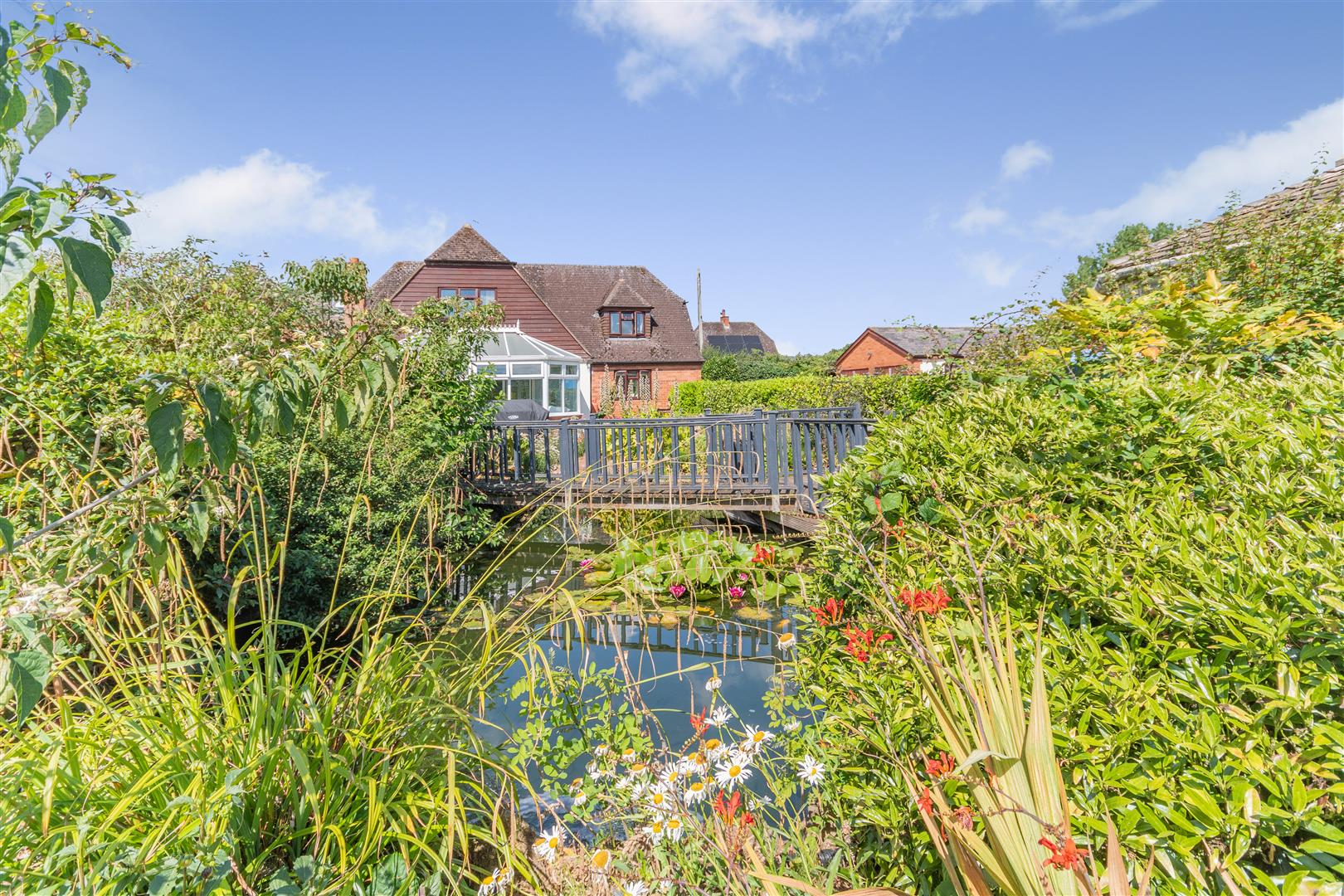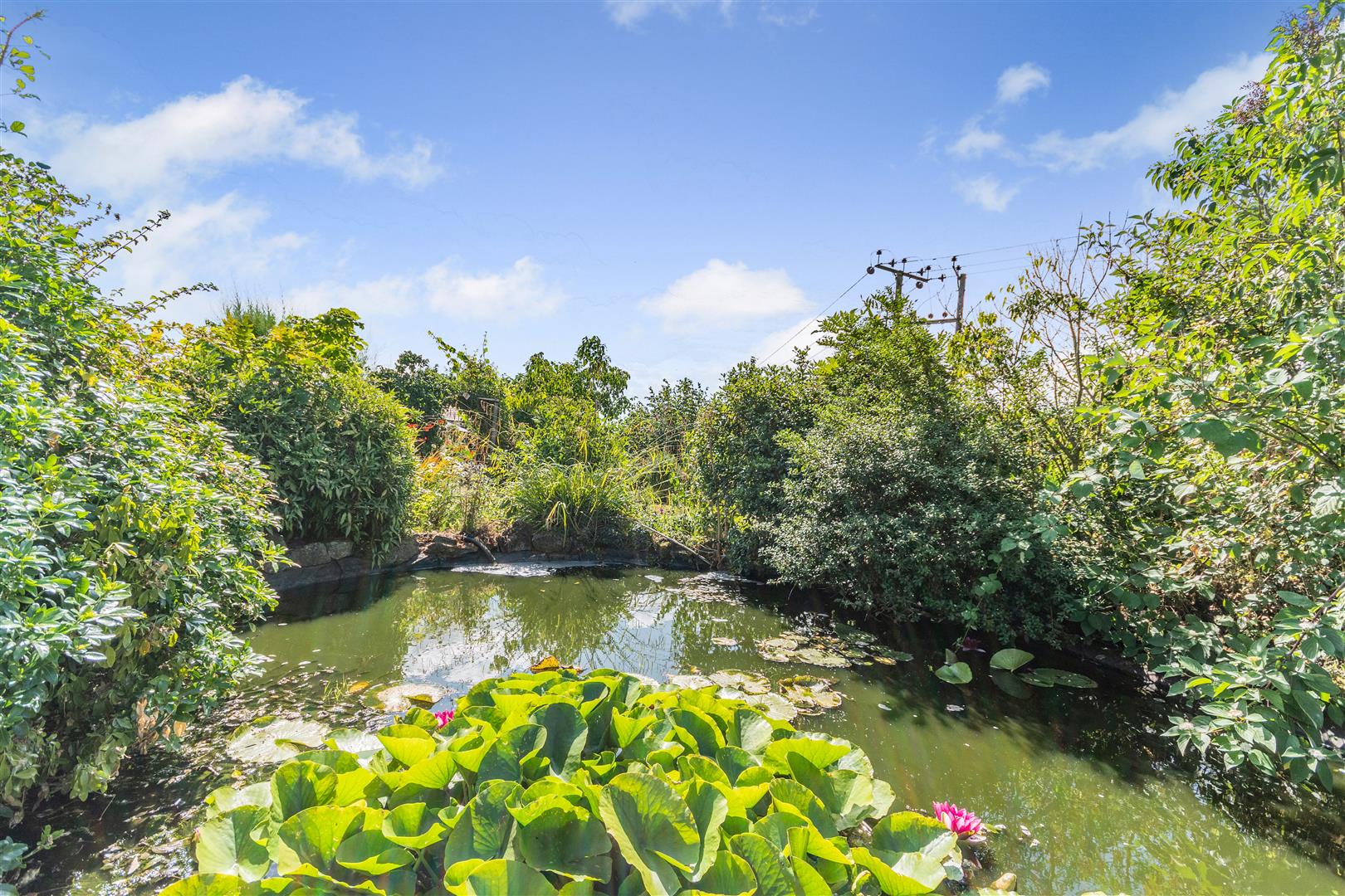 Behind the garage, you will find a substantial enclosed chicken run with a central pond.