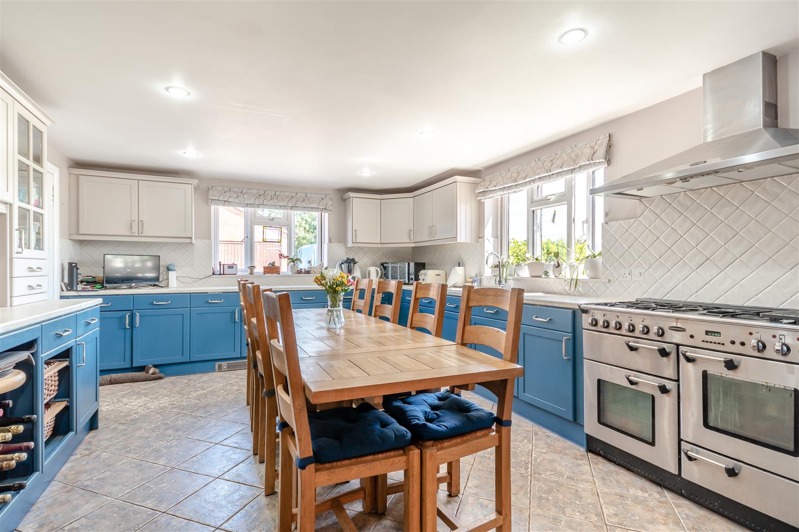 Kitchen - 5.23m x 3.96m (17'1" x 12'11") - One and a half bowl single drainer sink unit with mixer tap, cupboards under, range of base and wall mounted units, built-in dresser unit, fitted Rangemaster cooking range with five ring gas hob, warming plate, electric ovens below, built-in cooker hood above, integrated dishwasher, space for American style fridge, tiled flooring. Side and rear aspect windows with a lovely private outlook over the gardens. Extends into the: