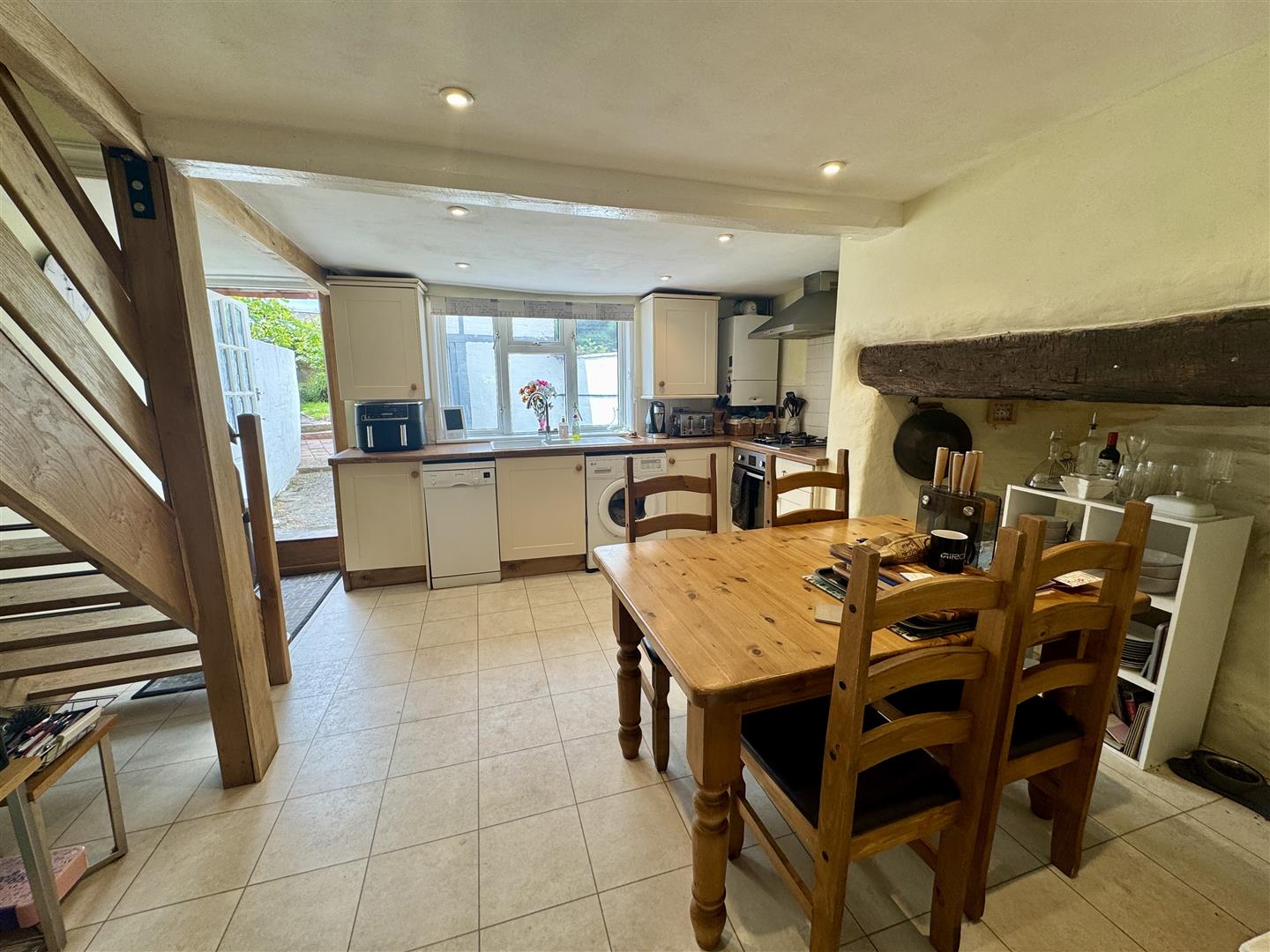 Kitchen / Dining Room - 4.22m x 3.68m (13'10 x 12'1) - One and a half bowl single drainer sink unit with mixer tap, cupboard under, base and wall mounted units, fitted electric oven, four ring gas hob over, cooker hood above, plumbing for washing machine and dishwasher, original feature fireplace, under stairs space, single radiator, exposed timbers, tiled flooring, stairs to the first floor, half glazed frosted door through to the rear garden, rear aspect window.