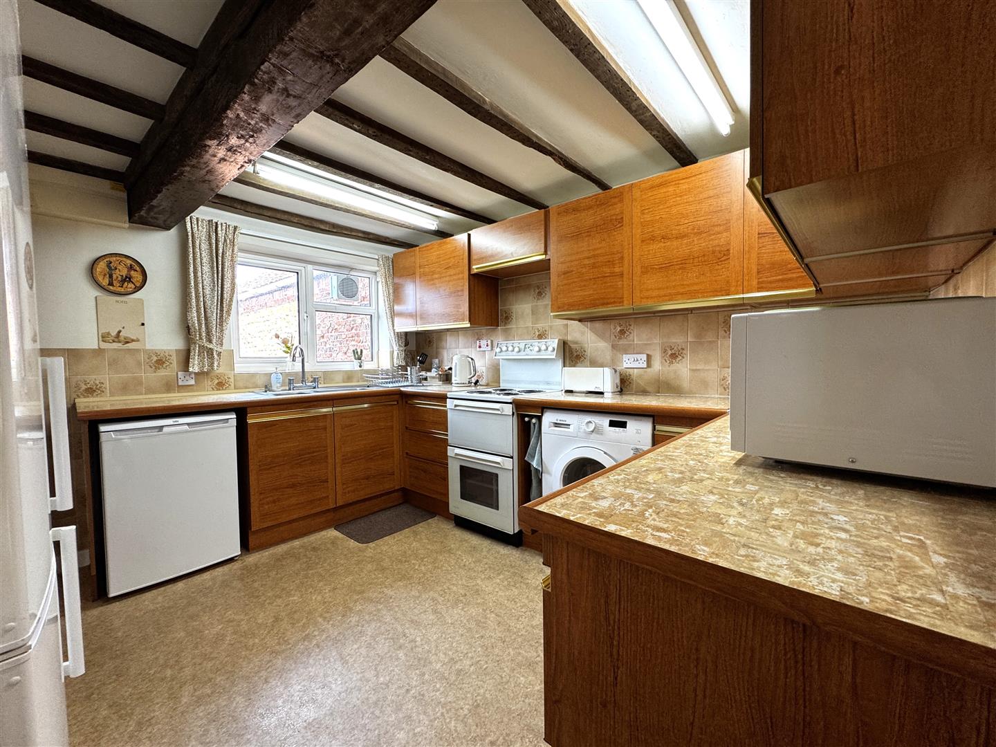 Kitchen - 3.53m x 2.97m (11'07 x 9'9) - One and a half bowl stainless steel single drainer sink unit with mixer tap, range of base and wall mounted units with laminated worktops and tiled splashbacks, plumbing for washing machine, space for under counter appliance, free standing electric double oven, radiator, front aspect window, glazed wooden door into: