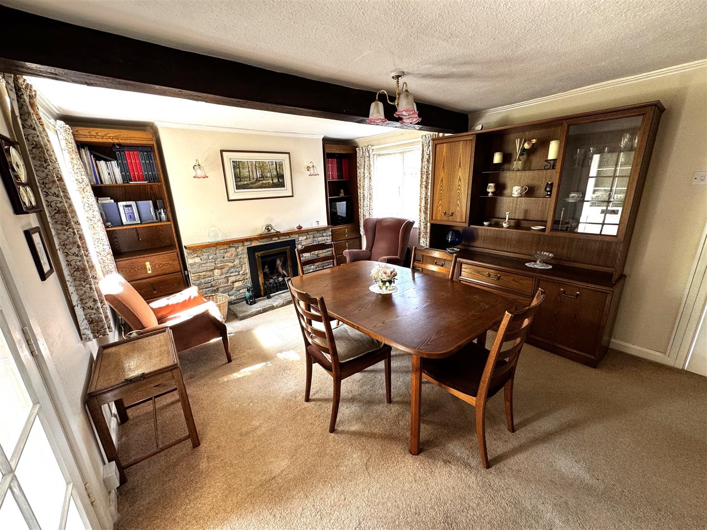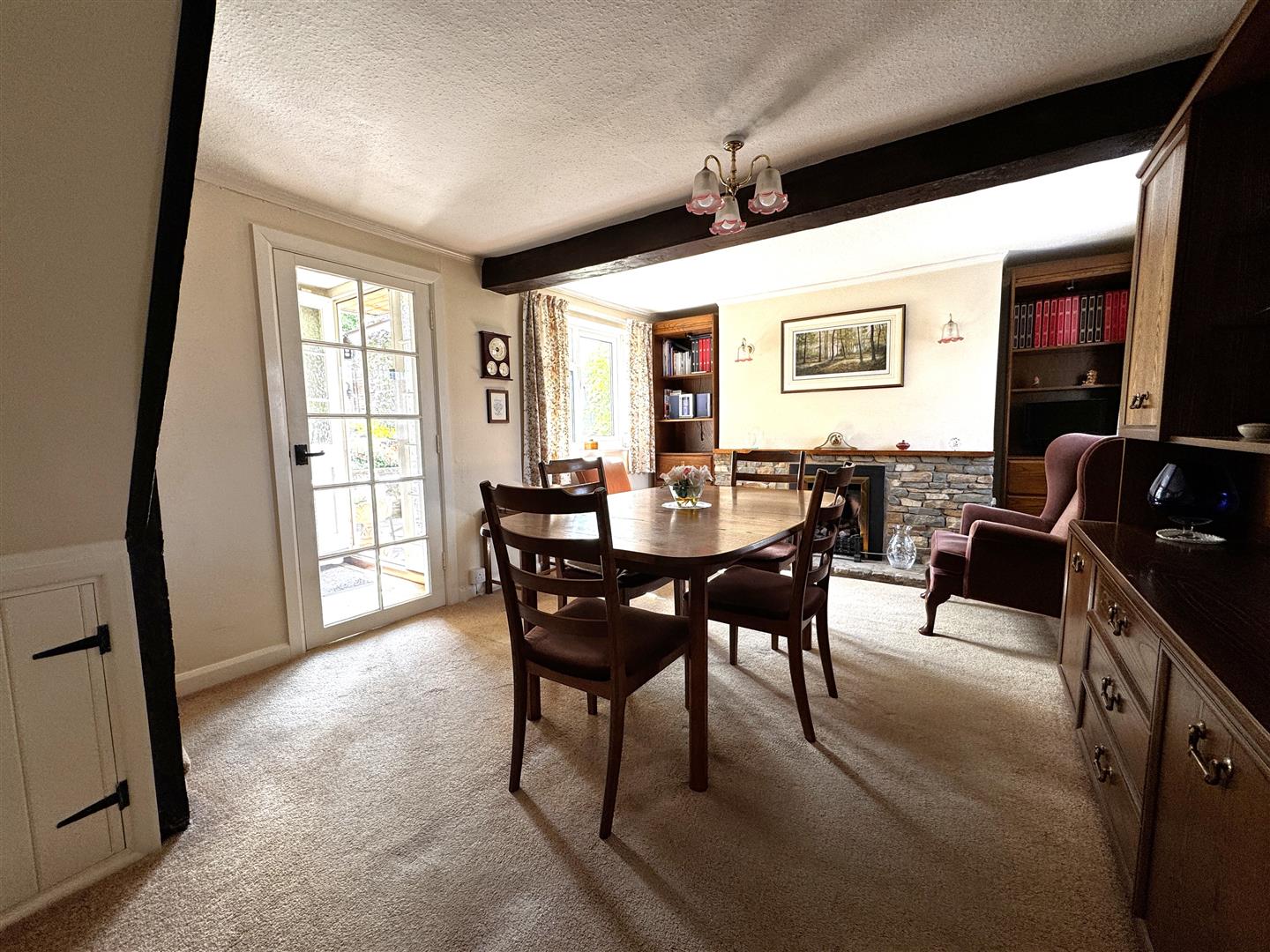 Dining Room - 4.95m x 3.48m (16'3 x 11'05) - Living flame gas fire with exposed stone feature fireplace, exposed beams, under stairs storage, double radiator, double aspect rear windows, glazed wooden door into: