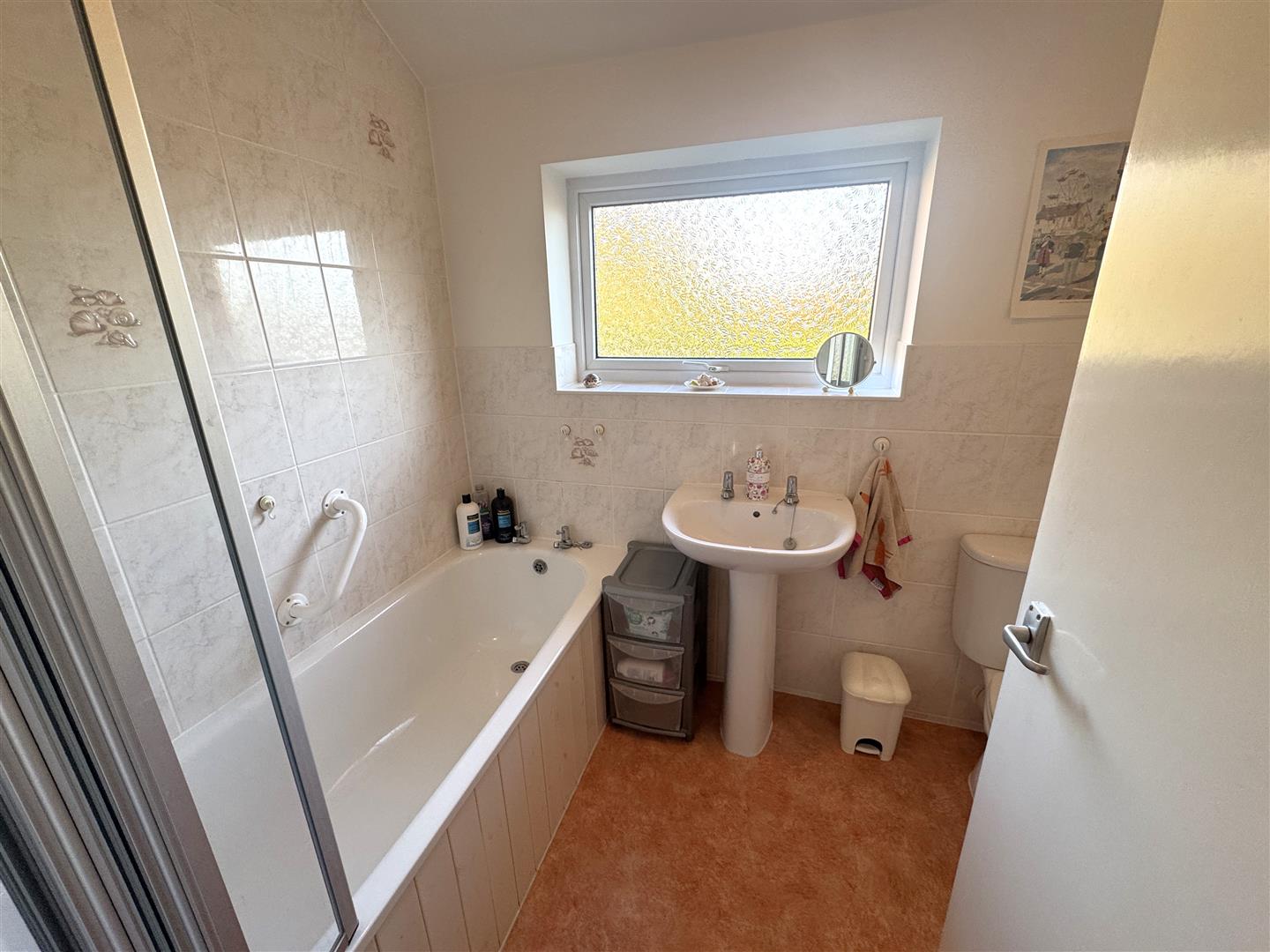 Bathroom - White suite comprising bath with shower over, tiled surround, pedestal wash hand basin, tiled splashback, close coupled WC, double radiator, rear aspect frosted window.