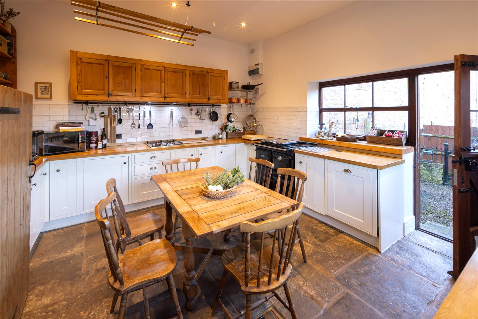 Kitchen / Dining Room - 4.50m x 4.14m (14'9 x 13'7) - Range of base and wall mounted units with wooden worktops and splashbacks, space for American fridge / freezer, plumbing for washing machine, integrated dishwasher, integrated water softener, built-in gas-fired Rayburn supplying the domestic hot water and central heating, flagstone floor with under floor heating, door to under floor wine storage, consumer unit, telephone point, extractor fan, inset spotlighting, one and a half bowl single drainer sink unit with mixer tap, rear aspect stable door, vaulted ceilings, rear windows and front aspect window.