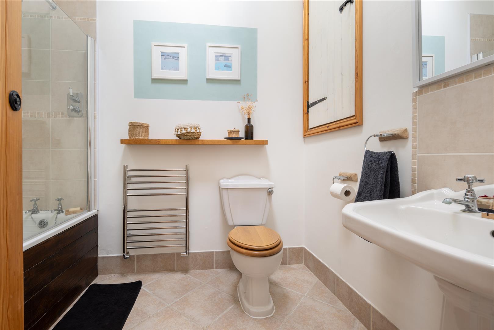 Bathroom - 2.49m x 1.83m (8'2 x 6'0) - White suite comprising of wood panelled bath with overhead shower, tiled splashbacks, low-level WC, pedestal wash hand basin, tiled floor, vaulted ceiling with exposed timberwork and roof light, extractor fan, door to airing cupboard.