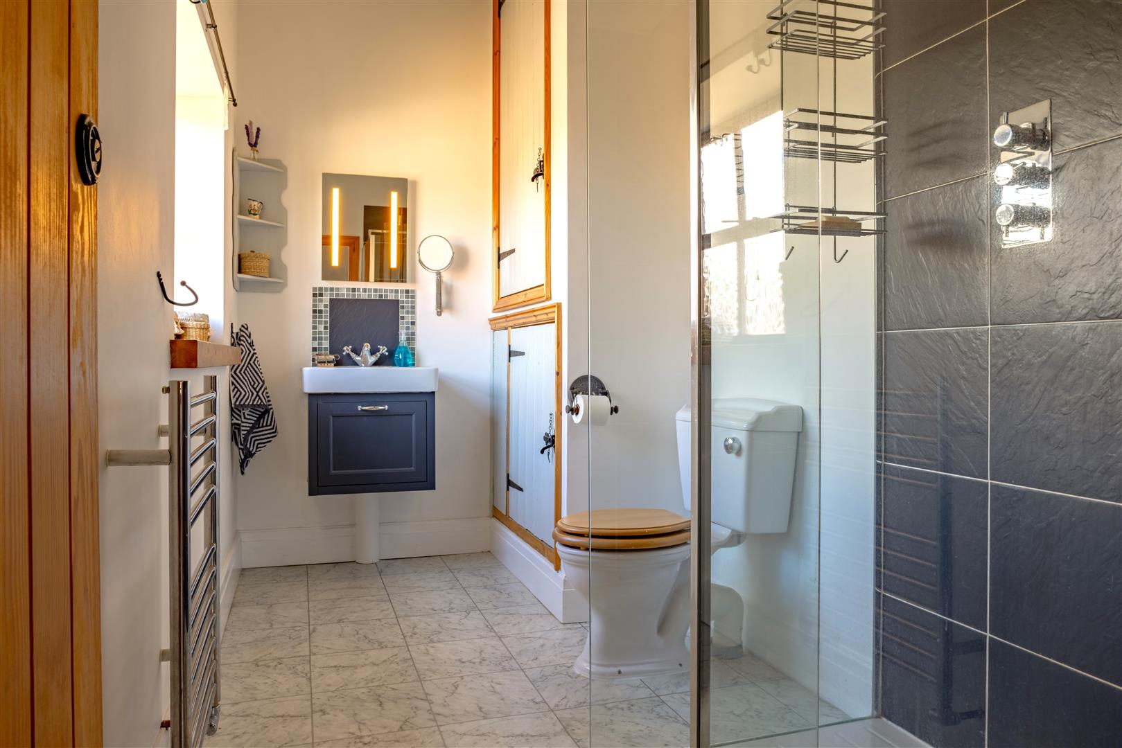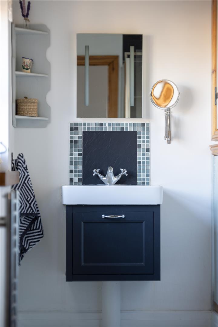 Cloakroom - 2.31m x 0.99m (7'7 x 3'3) - High level WC, vanity wash hand basin with mixer tap and cupboard below, flagstone flooring, inset spotlighting, extractor fan, rear aspect frosted window.