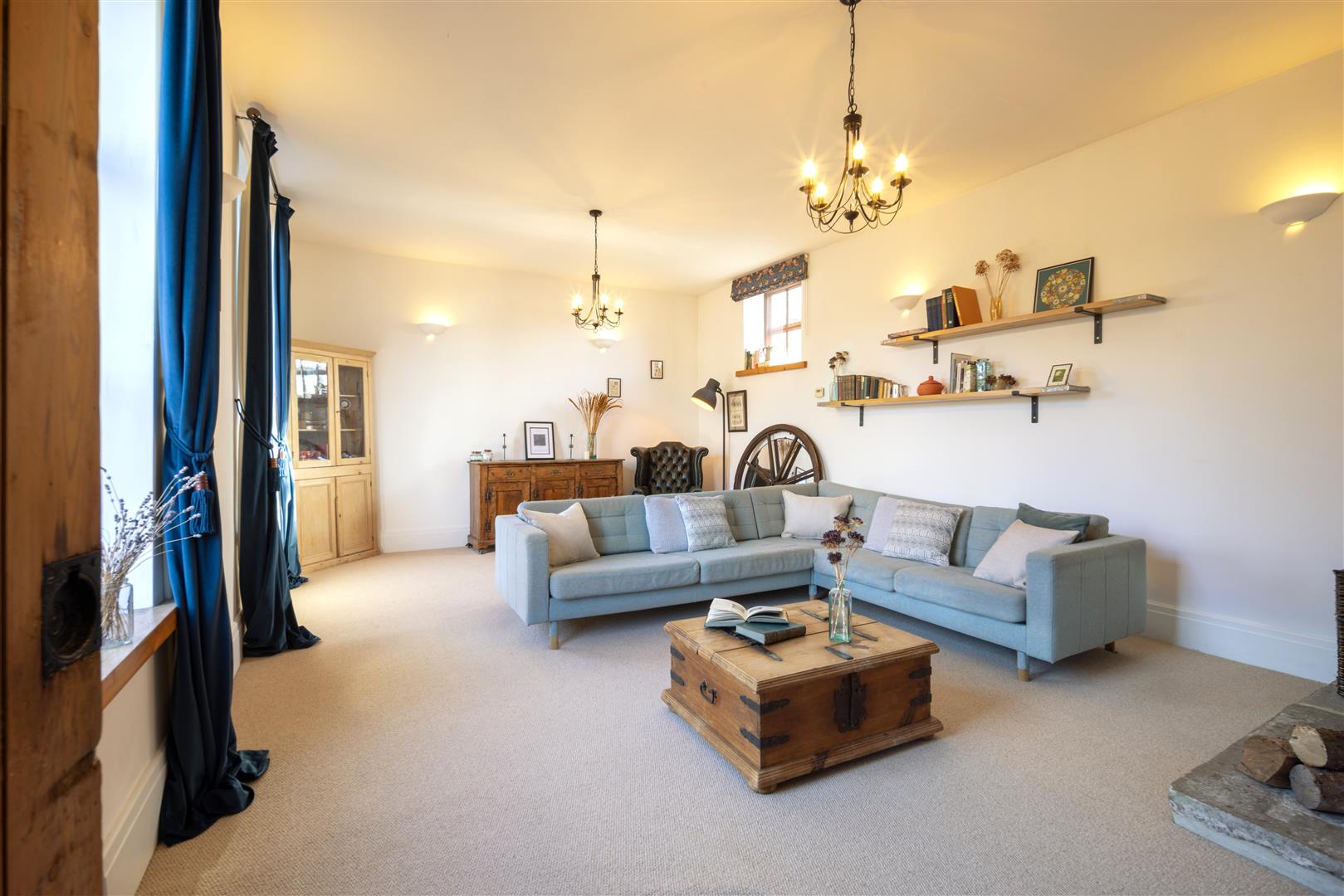 Lounge - 6.55m x 4.47m (21'6 x 14'8) - Thermostat controls, wall light fittings, under floor heating, telephone point, TV point, cast iron log burner with flagstone hearth, two large front aspect windows, rear aspect frosted window. A turning wooden staircase with cast iron balustrade leads to the first floor.
