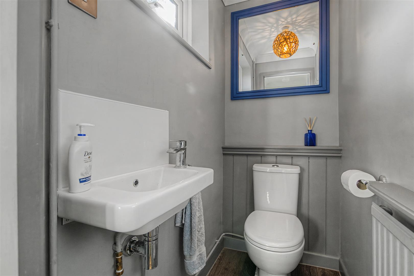 Cloakroom - White suite comprising close coupled WC, wash hand basin, single radiator, side aspect window.