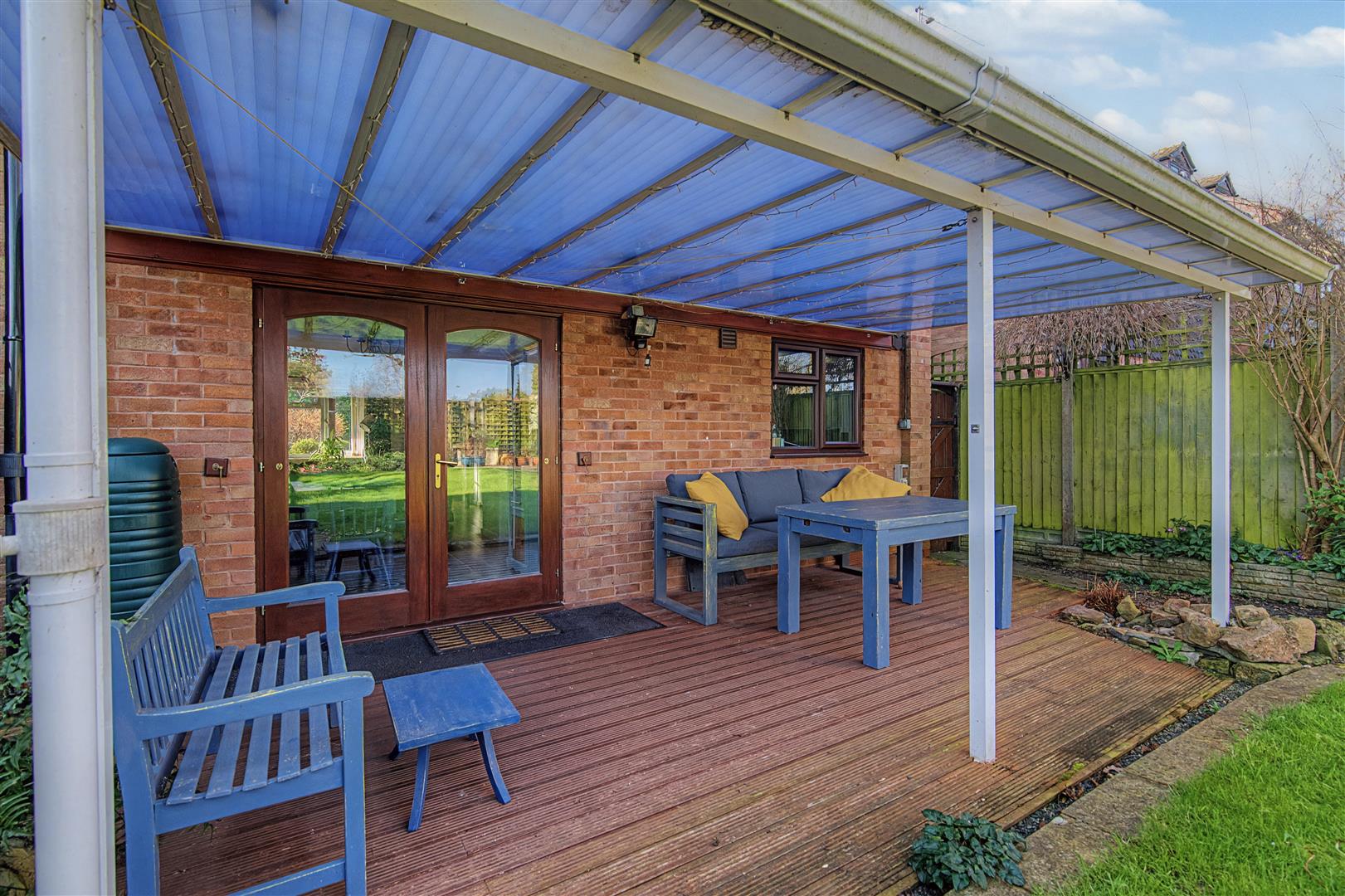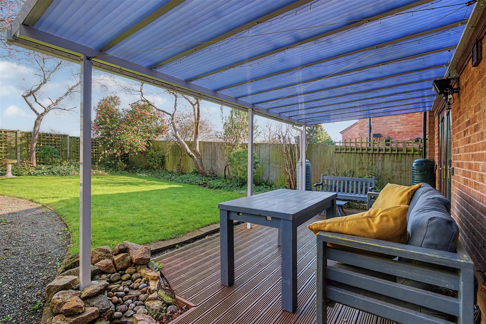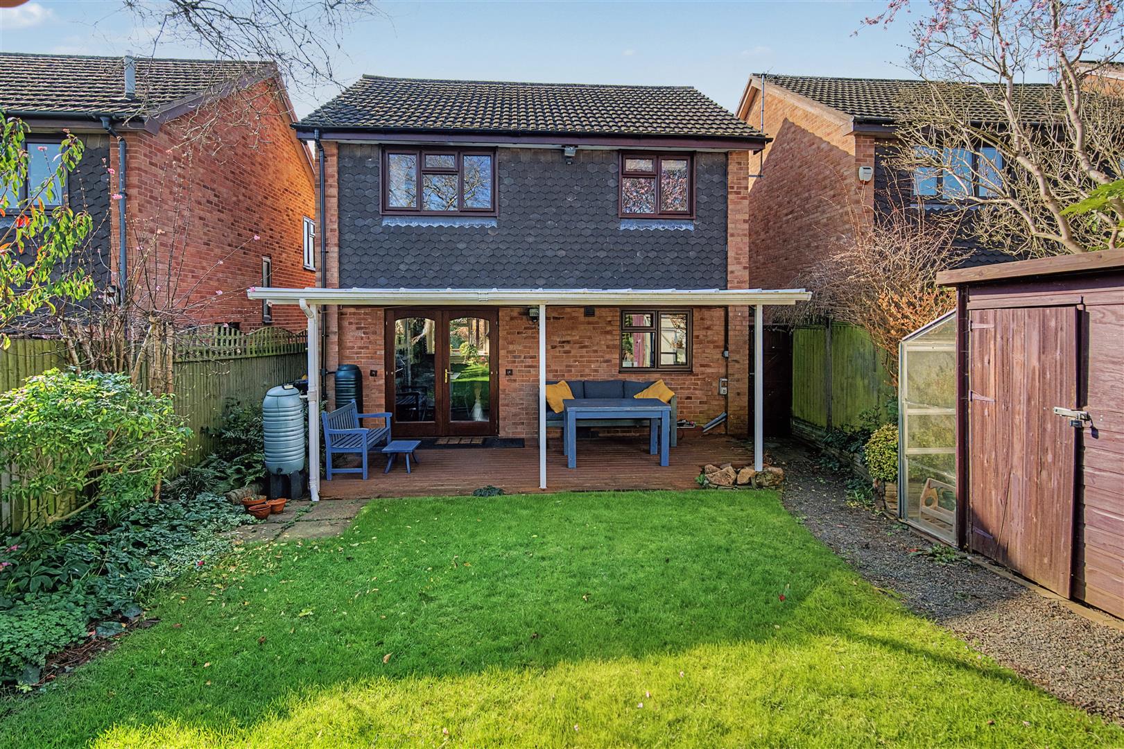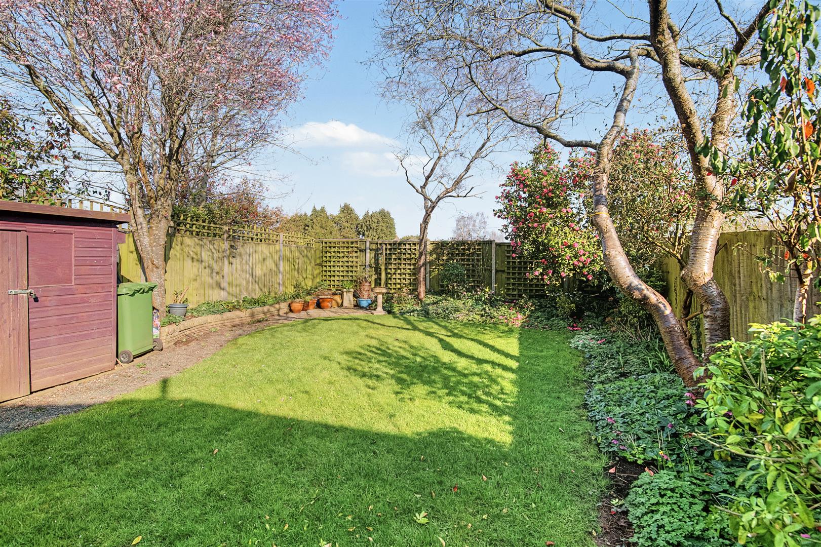Outside - To the front of the property there is a tarmac driveway, suitable for parking two vehicles, which leads to a single garage. The front of the property has a lawned area with interspersed flower beds and borders, mature shrubs, bushes and trees, outside lighting and an outside tap. A gated side access leads through to the private rear garden measuring approximately 50' x 28', having a raised decked area which is fully covered, ideal for outside entertaining. There is a good sized lawned area with flower borders surrounding, mature shrubs, bushes and trees, small green house, wooden shed, outside lighting and power.