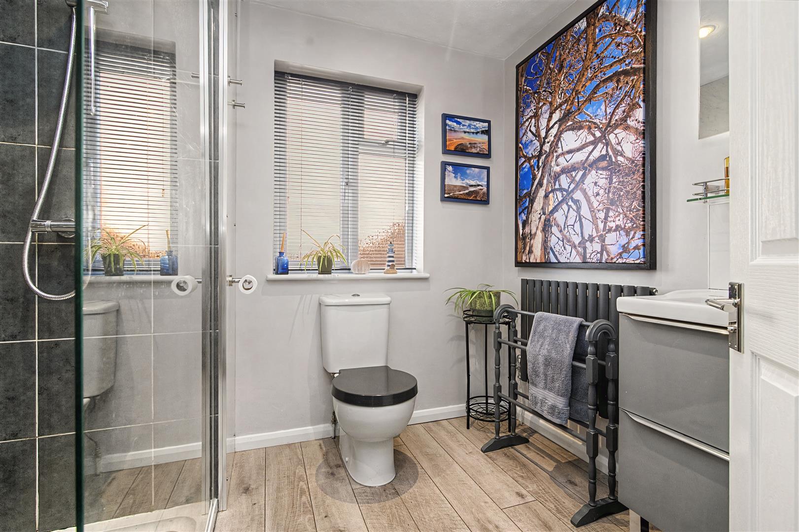 Shower Room - Walk-in double shower cubicle and tray, shower, tiled surround, close coupled WC, vanity wash hand basin, cupboards below, tiled splashbacks, heated towel rail, radiator, access to large storage cupboard, shelving, side aspect frosted window.