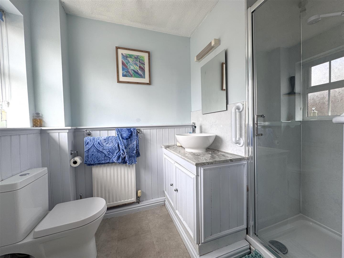 En-Suite Shower Room - 2.57m x 1.70m max (l shaped) (8'5 x 5'7 max (l sha - Single shower cubicle with Mira Sports shower, laminated splashbacks, vanity wash hand basin with mixer tap and cupboard below, WC, radiator, front aspect frosted window.