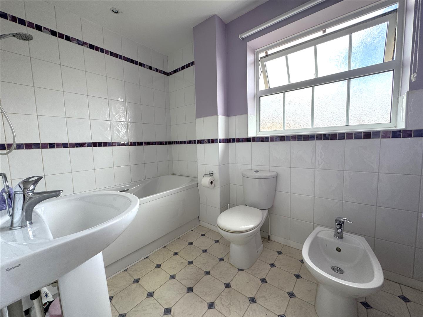 Bathroom - 2.64m x 1.75m (8'8 x 5'9) - Bath with mixer tap and electric shower over, pedestal wash hand basin with mixer tap, WC, bidet, chrome heated towel rail, spotlighting, rear aspect frosted window.
