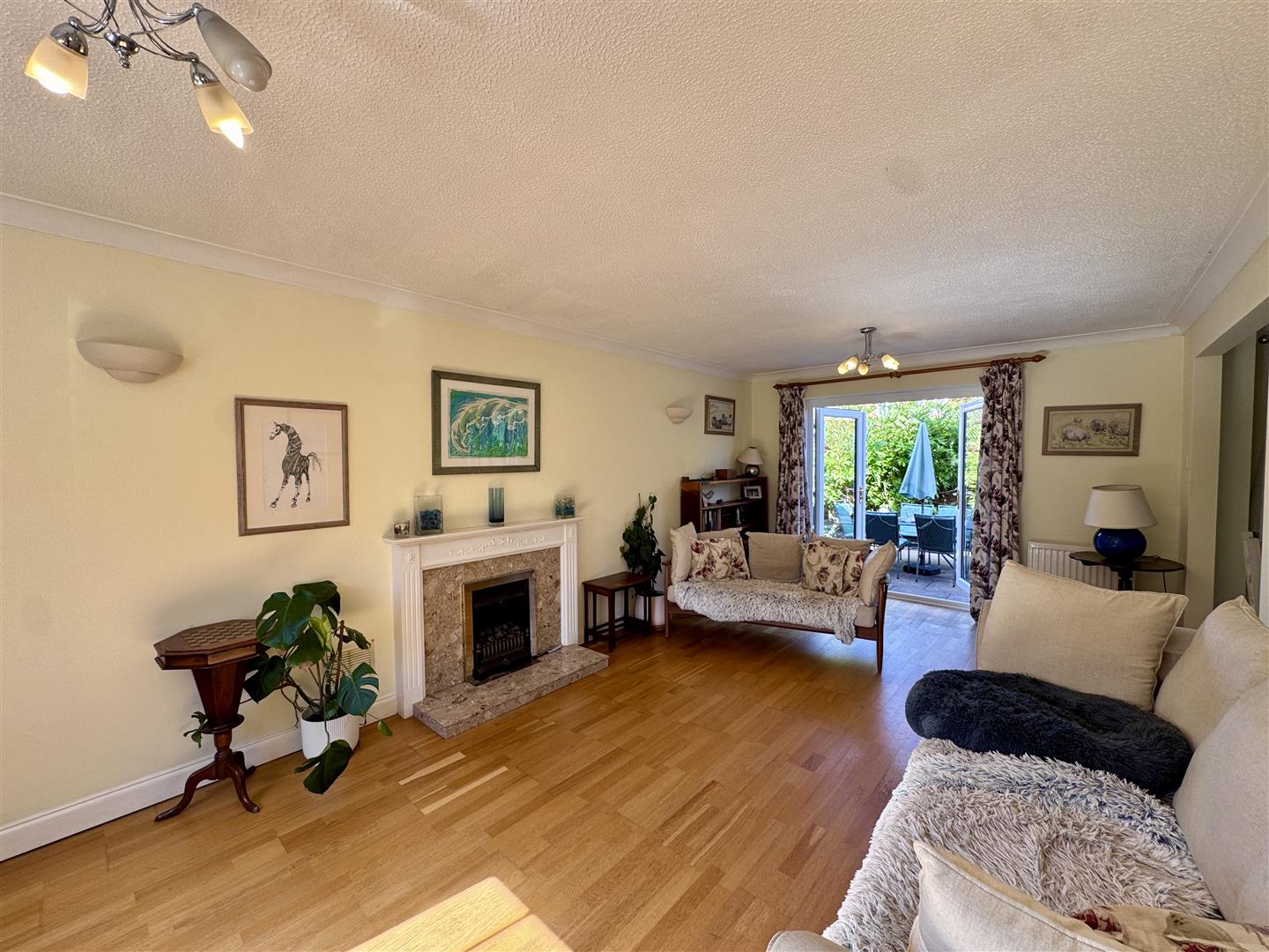 Lounge - 6.71m x 3.45m (22'0 x 11'4) - Living flame gas fire, two radiators, wooden flooring,TV point, front aspect window and rear aspect double opening French doors to the gardens. Opening through to: