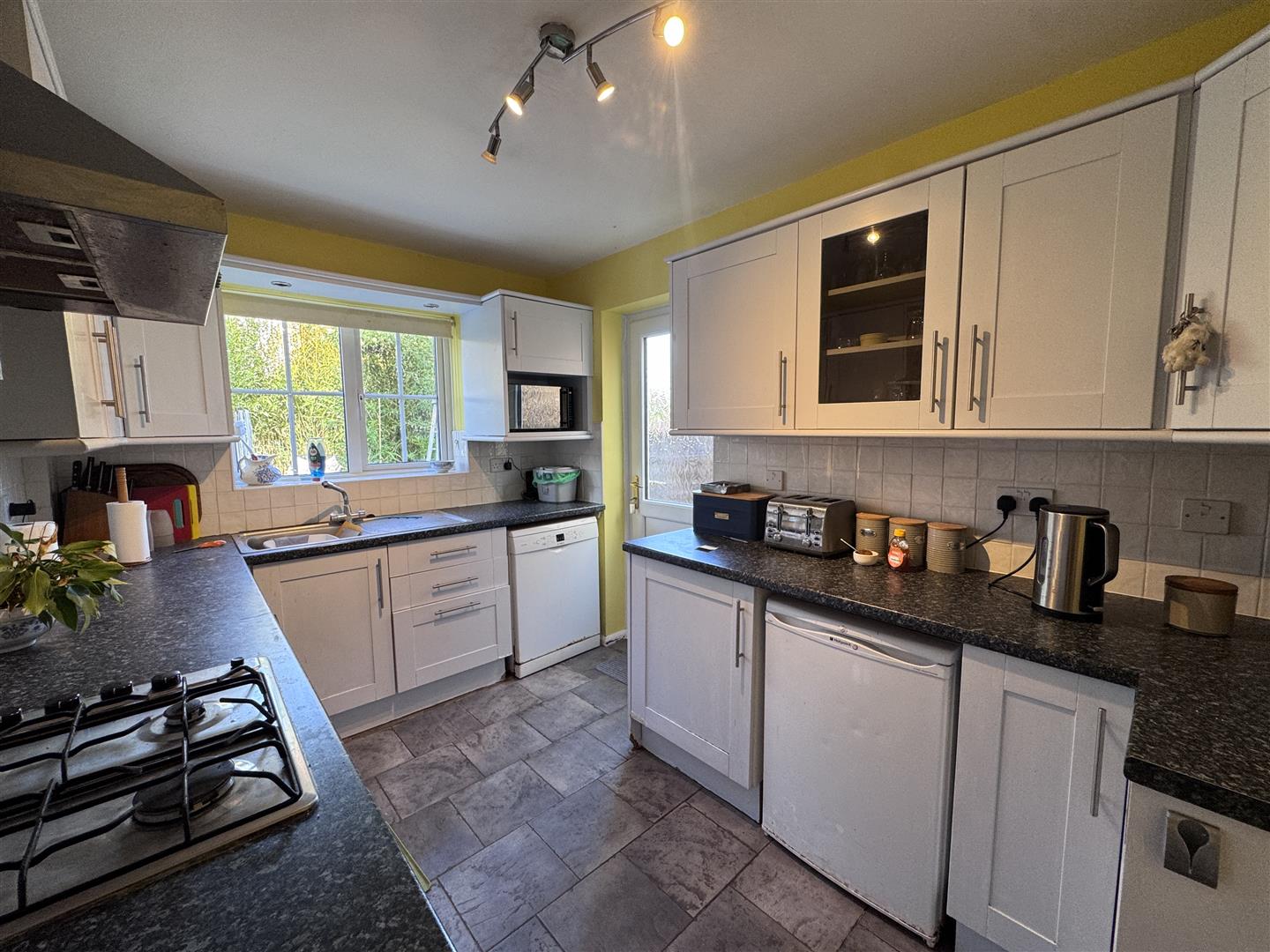 Kitchen - 3.66m x 2.34m (12'0 x 7'8) - The kitchen comprises of a range of base and wall mounted units with laminated worktops and tiled splashbacks, integrated Stoves oven with four ring gas hob, plumbing for washing machine, plumbing for dishwasher, under counter fridge, tiled flooring, radiator, half glazed UPVC door to the gardens.