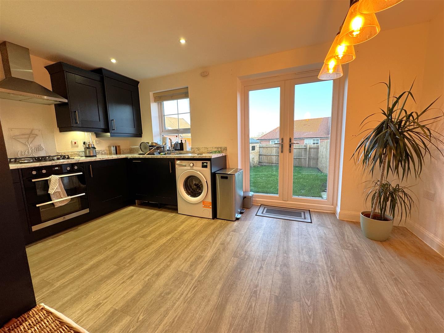 Kitchen/Diner - 4.57m x 3.05m (15' x 10') - Range of base and wall mounted units with laminated worktops and splashbacks, integrated Electrolux double oven with four ring gas hob and extractor fan over, integrated dishwasher and fridge/freezer, Beko washing machine and tumble dryer (available via separate negotiation), single drainer stainless steel sink with mixer tap, inset spot lighting, double radiator, rear aspect window and double opening French doors to patio and gardens.