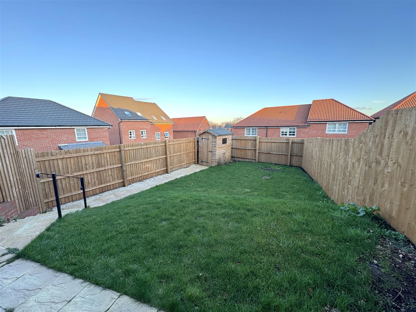 A patio/seating area with grassed terrace, steps lead down to a further patio area and lawned area, wooden garden shed, outside water tap, lighting and power point, all enclosed by wood panelled fencing.
