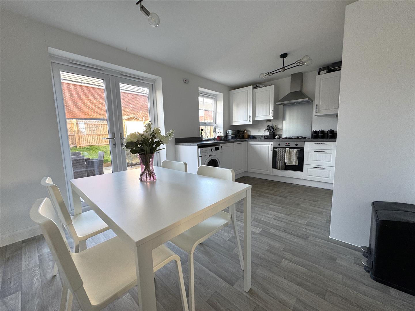 Kitchen / Diner - 4.57m x 3.05m (15'0 x 10'0) - Range of base and wall mounted units with laminated worktops and splashbacks, plumbing for washing machine, single drainer stainless steel sink unit with mixer tap, integrated dishwasher, single electric oven with four ring Zanussi gas hob, glass splashback and extractor fan over, integrated fridge / freezer, double radiator, rear aspect window. Double opening French doors to patio and gardens.
