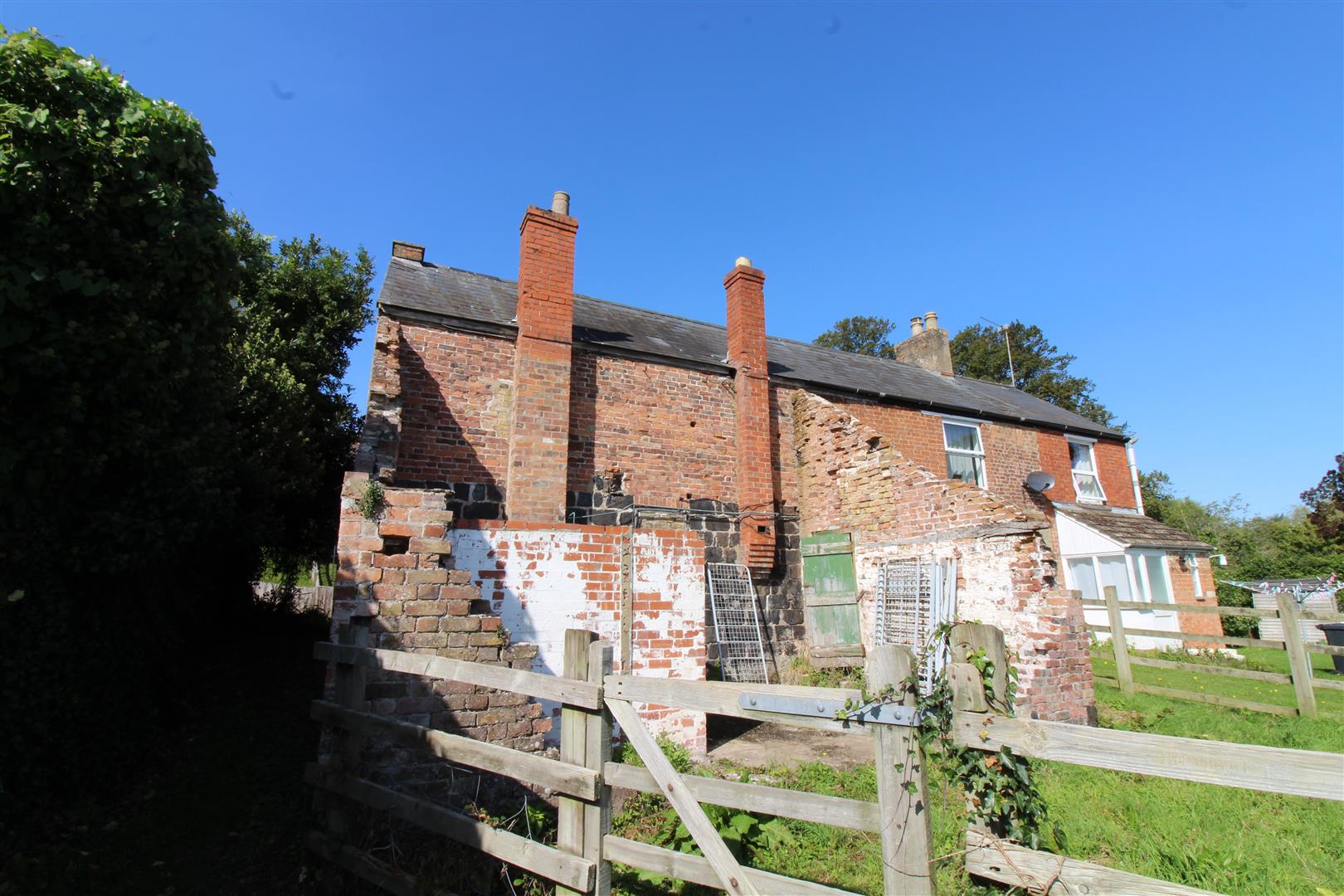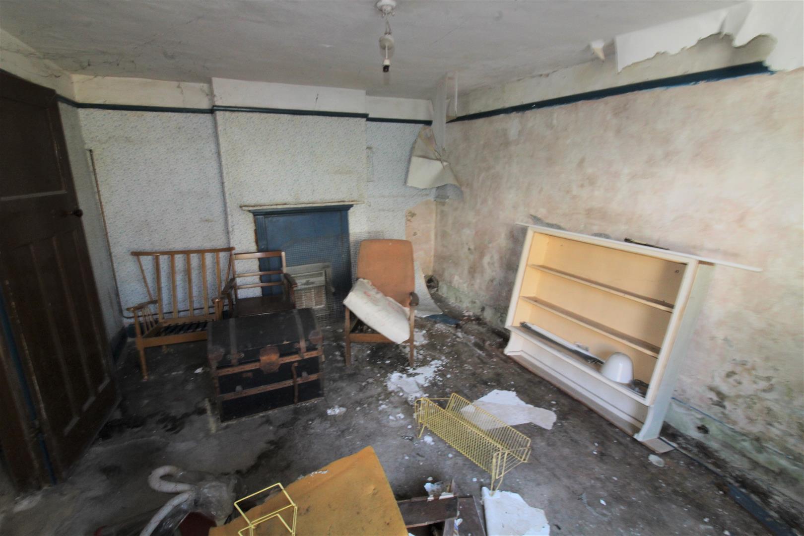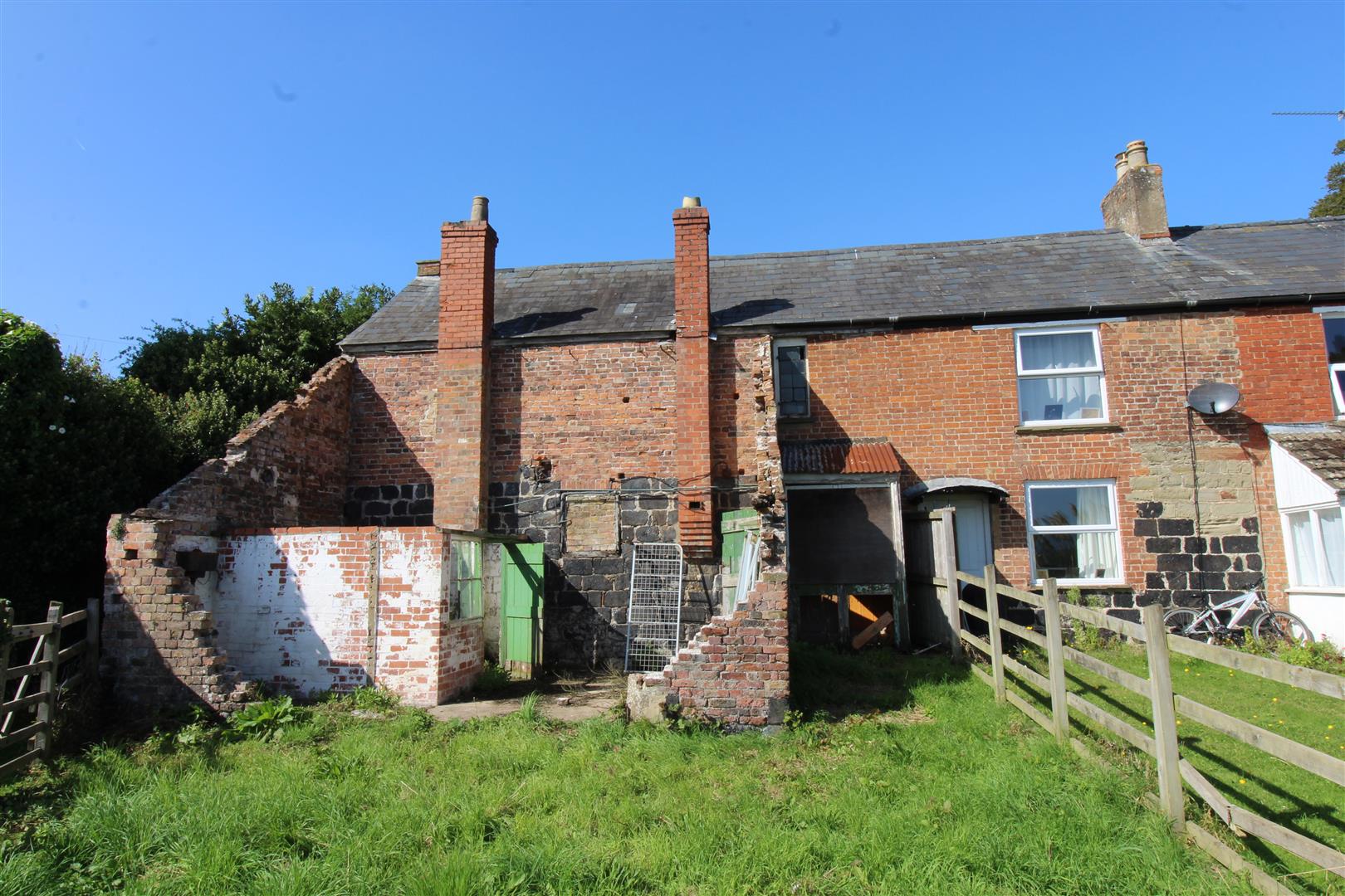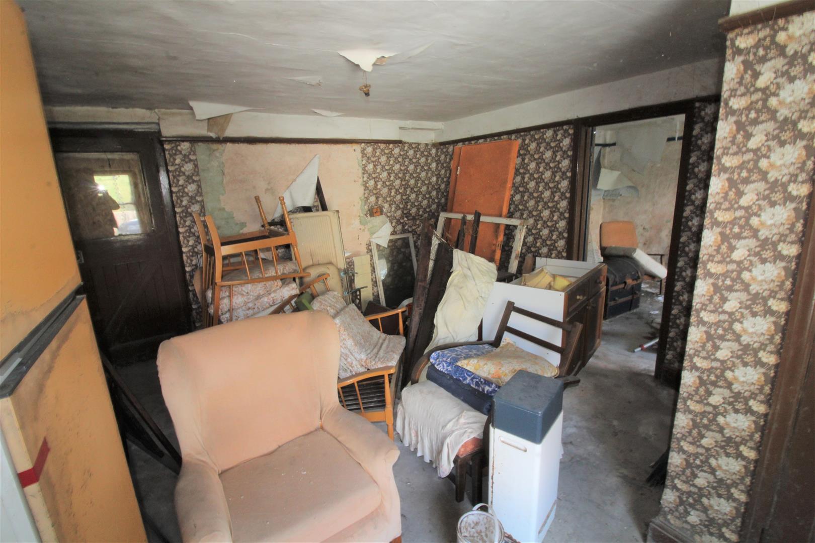 Outside - From room one, a door leads out to a small rear porch. There is also the remains of a former extension which previously housed the kitchen and bathroom.