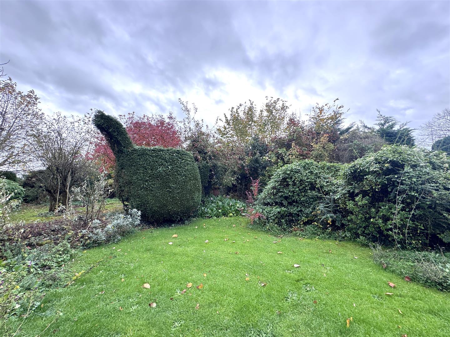 To the front of the property, there is a large expanse of lawn, mature shrubs, bushes and trees, outside lighting.