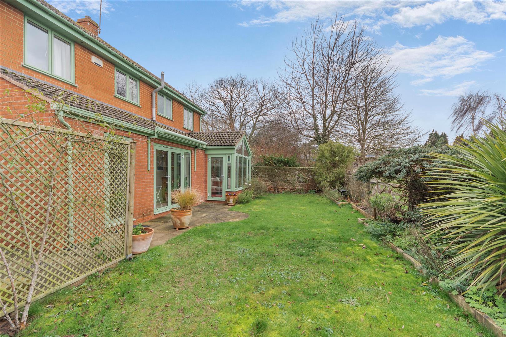 The front garden is laid to lawn with several mature trees and is enclosed by hedging.