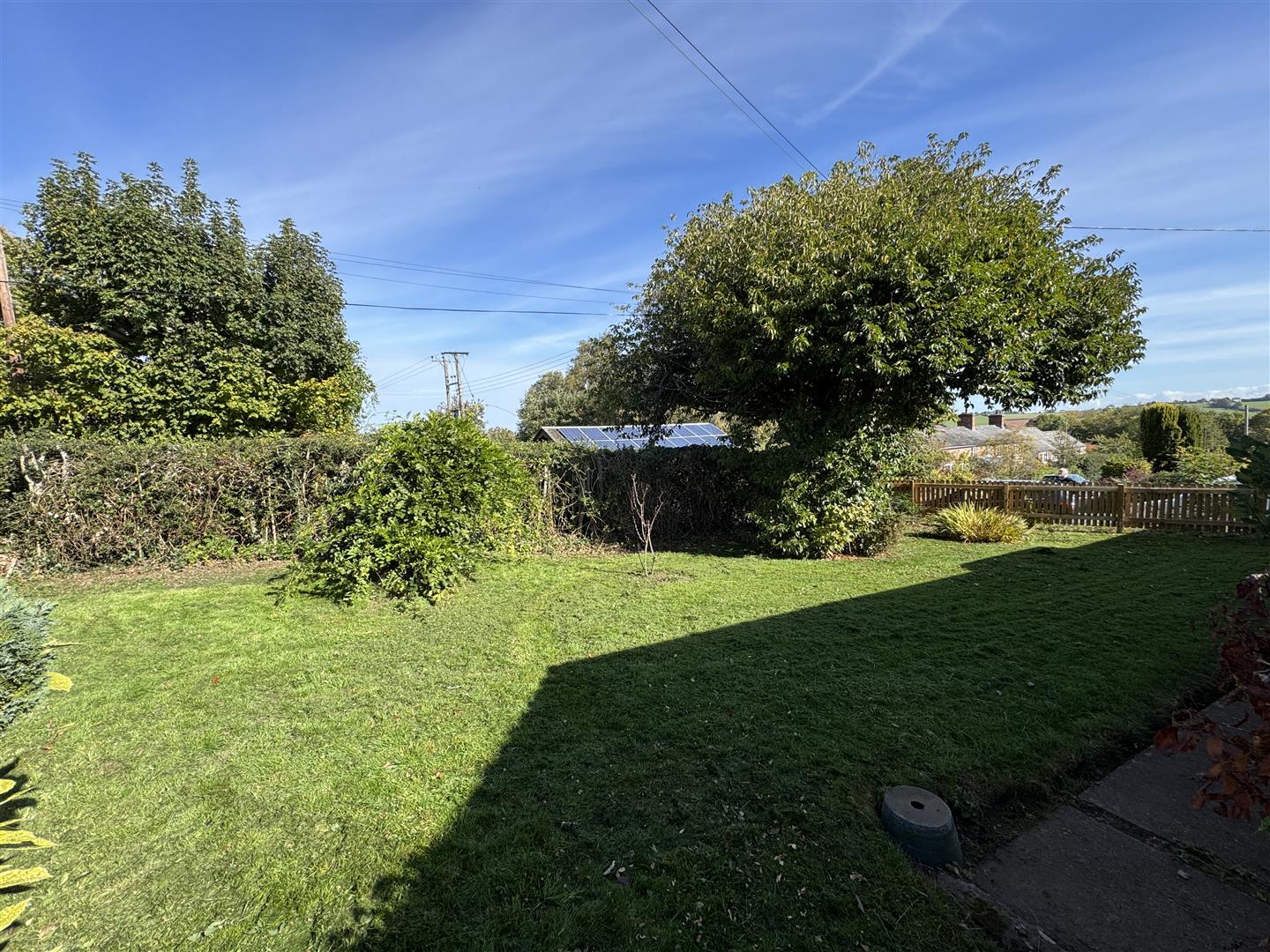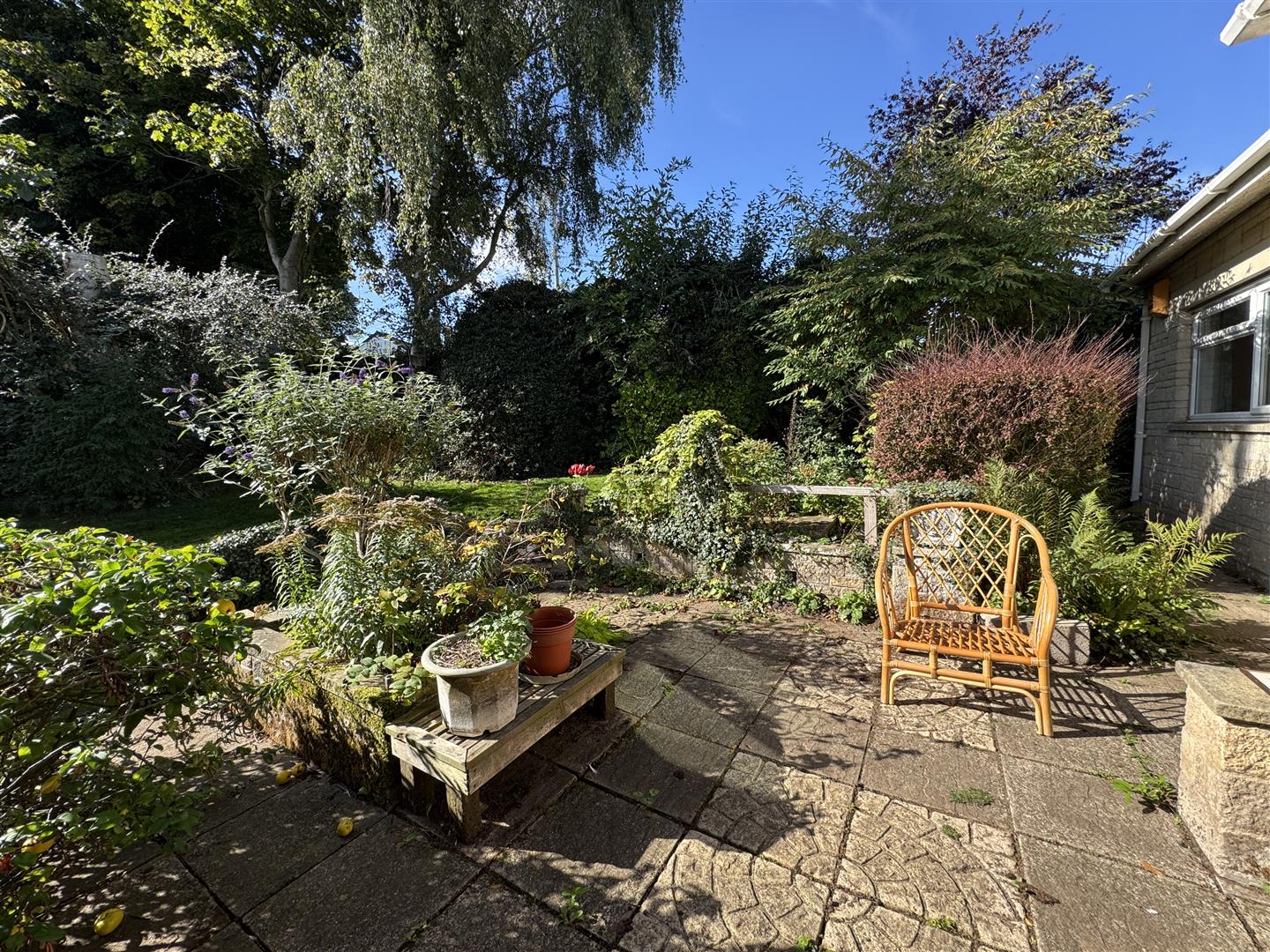 A side path and gated access, via steps, leads to the rear garden. The property sits centrally within a large mature plot to the front. There are lawned areas and several mature trees and shrubs. The pathway continues around the front and side of the property to the rear, where there are mature planted beds, further lawned areas, patio seating area, all enclosed by wood panel fencing and hedging. The garden offers very good levels of privacy.