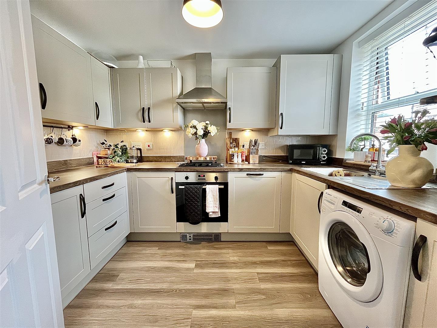 Kitchen - 3.02m x 2.34m (9'11 x 7'08) - Modern wall and base level units with laminate worktops and splash-backs, integral stainless steel sink unit with drainer, integral electric oven with gas hob and extractor hood above with stainless steel splash-back, integral dishwasher and fridge/freezer, space and plumbing for a washing machine, laminate wood flooring, front aspect window.