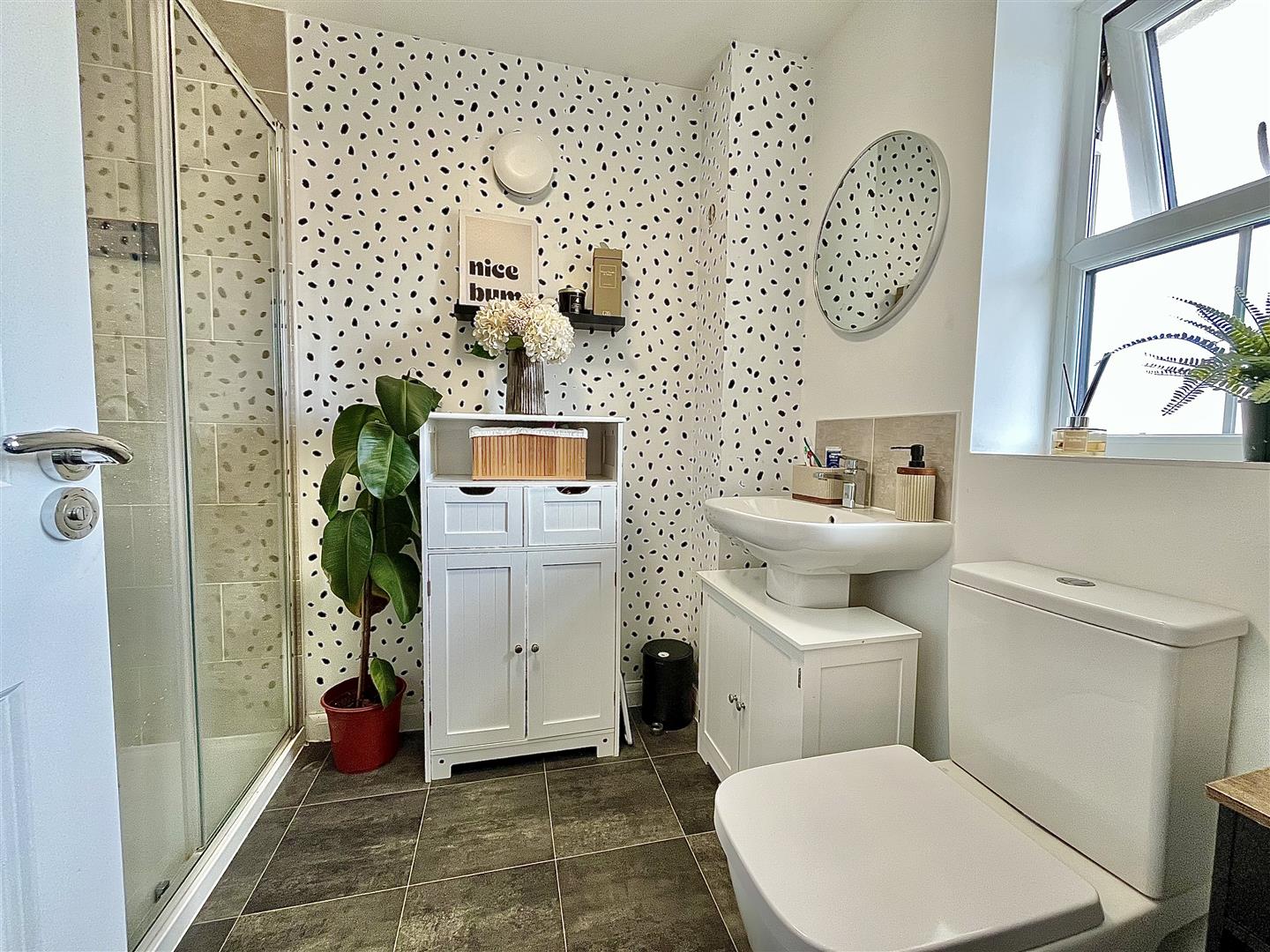 En-Suite Shower Room - 2.36m x 1.88m (7'09 x 6'02) - Walk-in mains fed shower with tiled surround, close coupled w.c, pedestal washbasin with tiled splash-backs, heated towel rail, obscured rear aspect window.