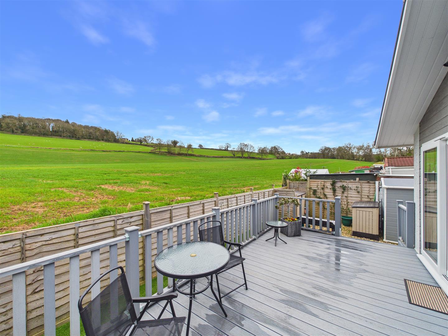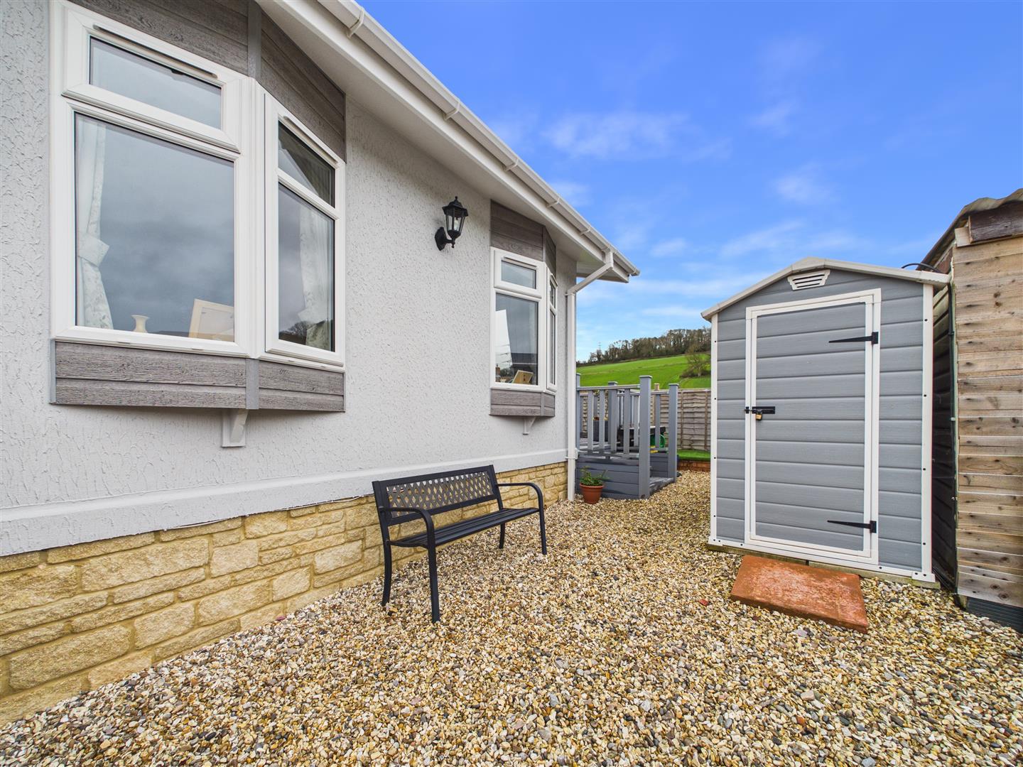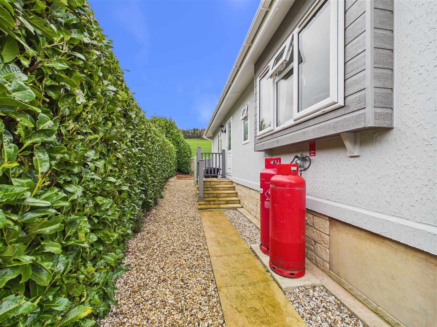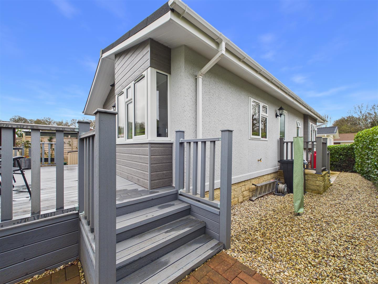 Outside - Set on a generous corner plot and backing onto open fields, this park home enjoys a peaceful and private setting. To the front, a block-paved driveway provides ample parking, complemented by low-maintenance gravel borders. To the side, a raised sun terrace with composite decking offers an ideal space for outdoor relaxation, complete with a timber balustrade and steps leading down to both the front and rear gardens. The property also benefits from a useful storage shed and an LPG Calor gas connection point.