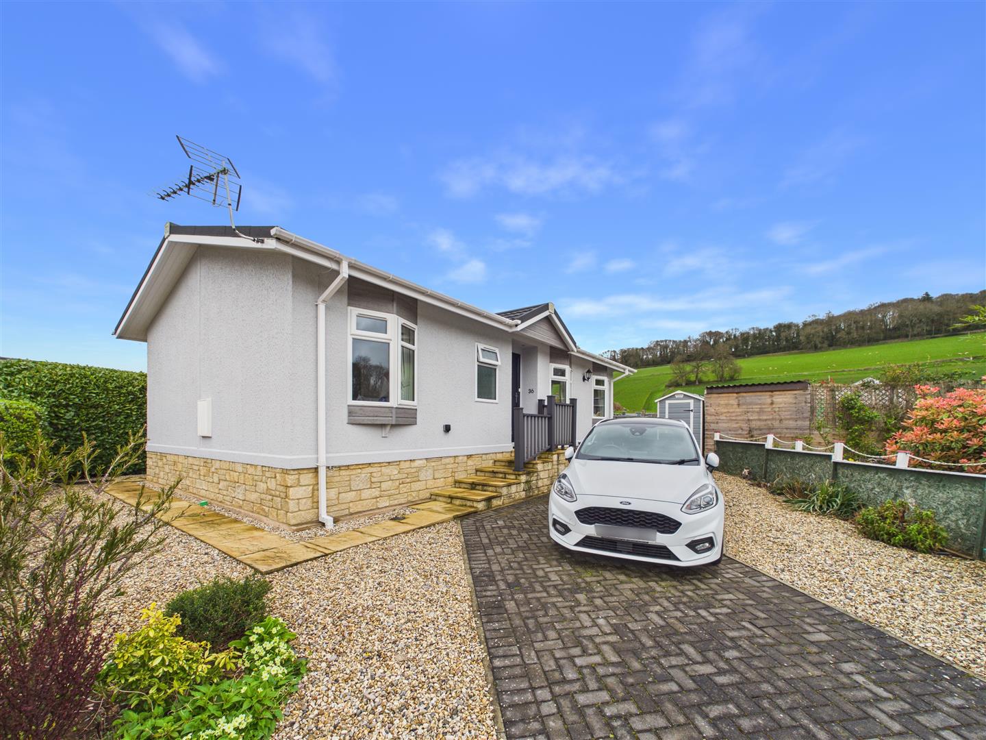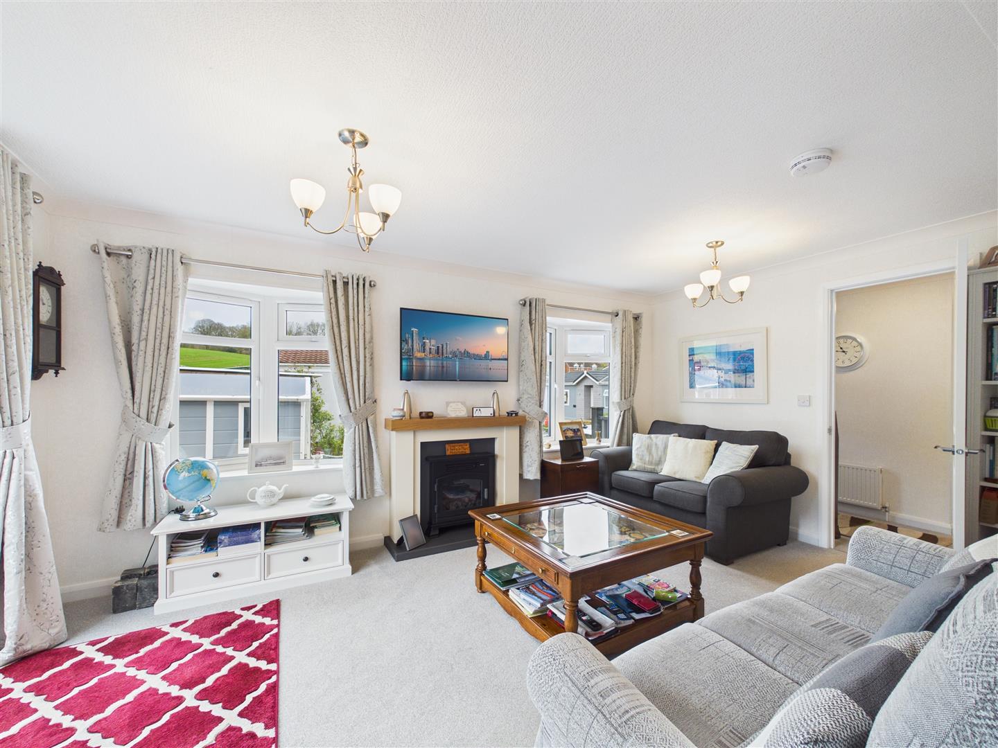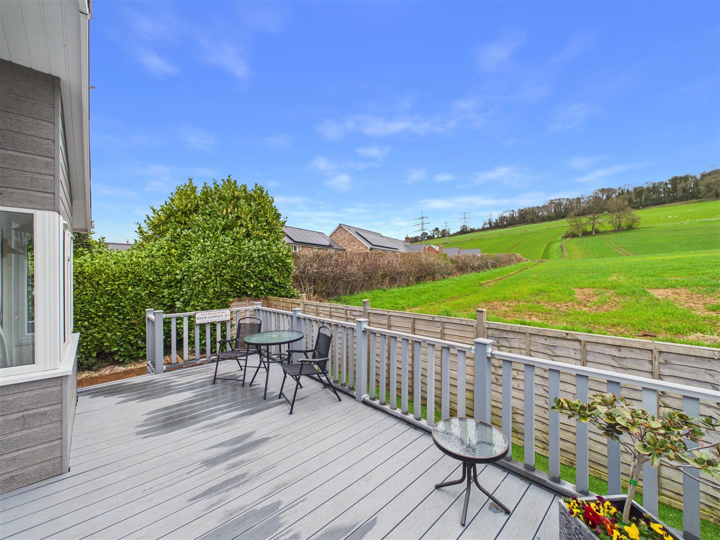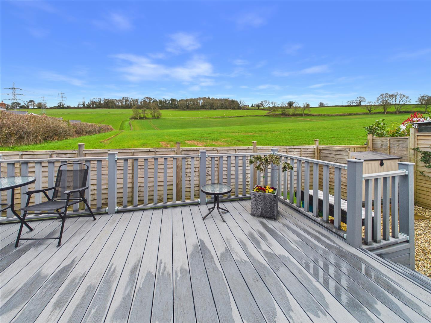 Outside - Set on a generous corner plot and backing onto open fields, this park home enjoys a peaceful and private setting. To the front, a block-paved driveway provides ample parking, complemented by low-maintenance gravel borders. To the side, a raised sun terrace with composite decking offers an ideal space for outdoor relaxation, complete with a timber balustrade and steps leading down to both the front and rear gardens. The property also benefits from a useful storage shed and an LPG Calor gas connection point.