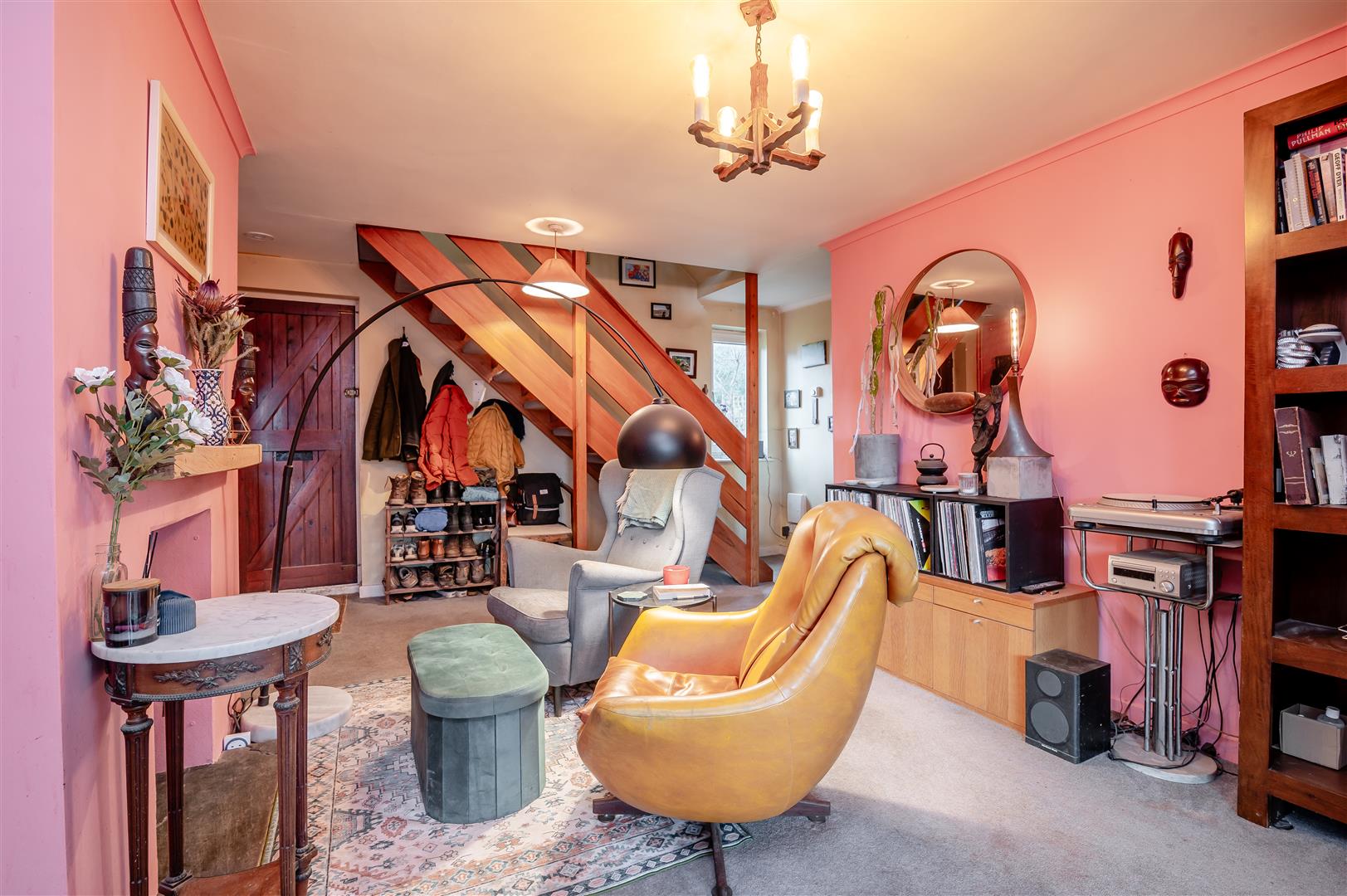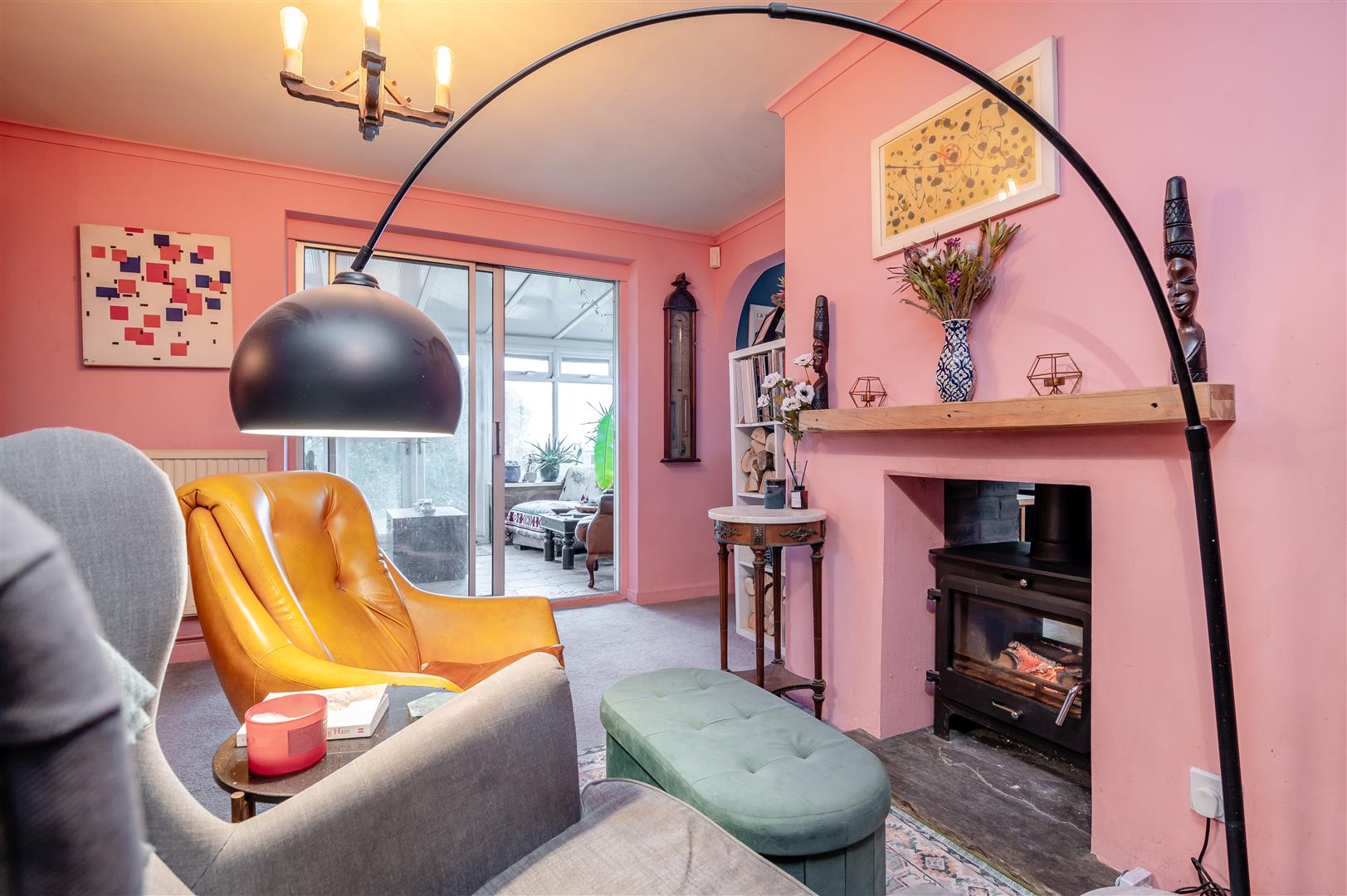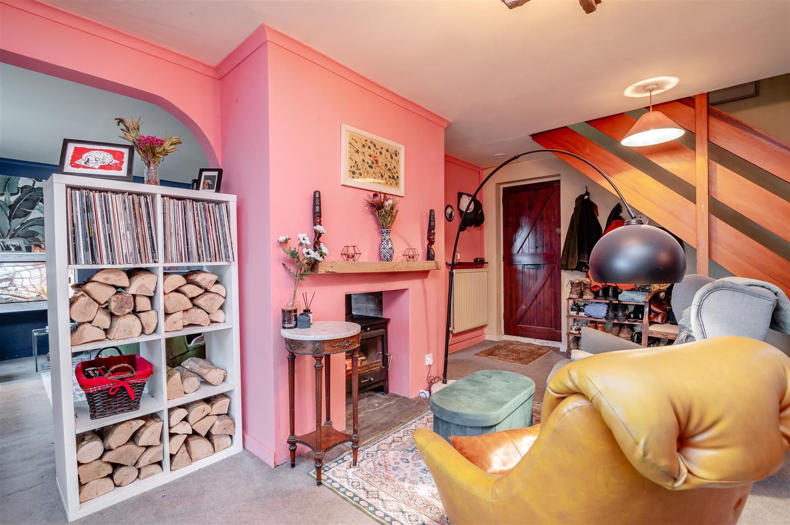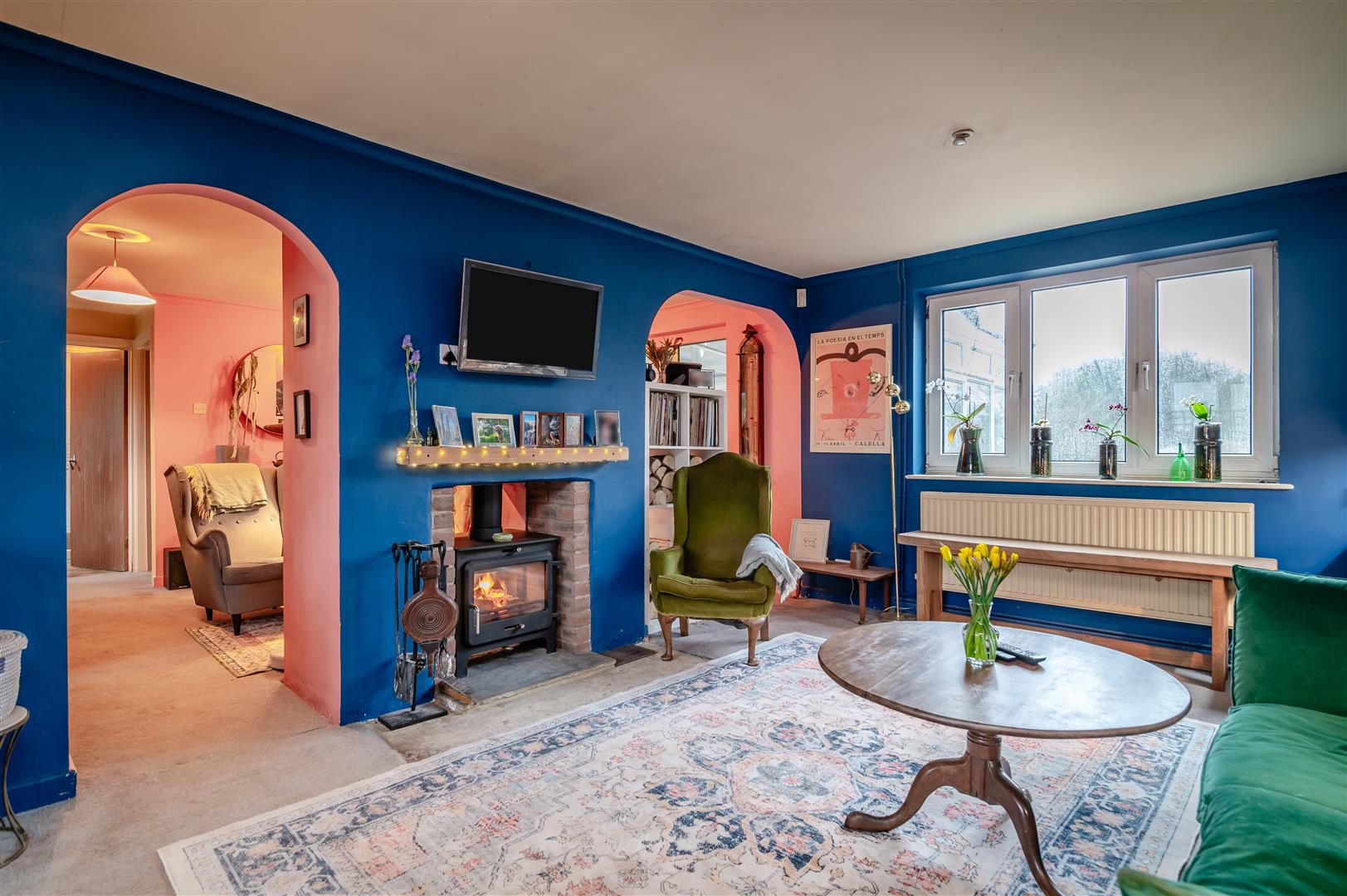 Sitting Room - 4.70m x 5.28m (15'05 x 17'04) - Double sided feature fireplace with wood burning stove, ideal for those cosy nights in by the fire, power points, radiator, coving, stairs leading to the first floor, front aspect double glazed UPVC window. Two archways either side of the fireplace give access to: