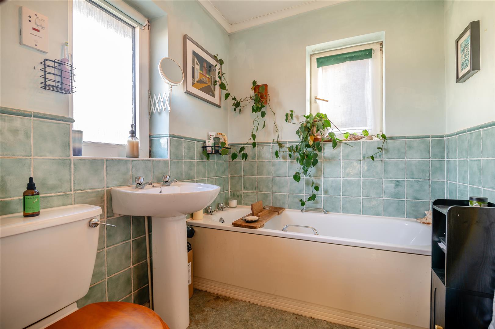 Bathroom - Suite comprising of panelled bath, pedestal wash hand basin, low-level WC, radiator, part tiled walls, coving, front and side aspect double glazed UPVC windows.