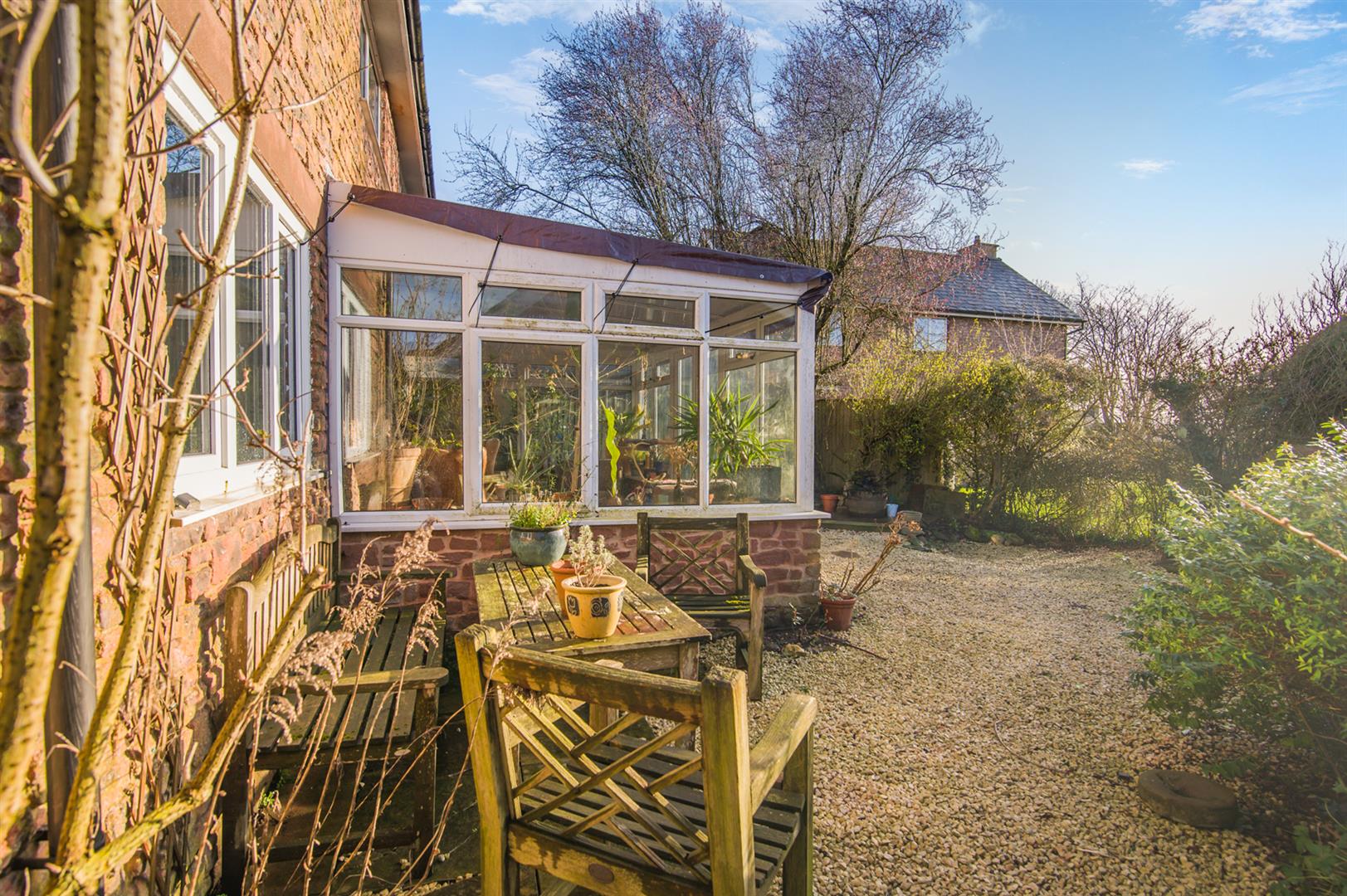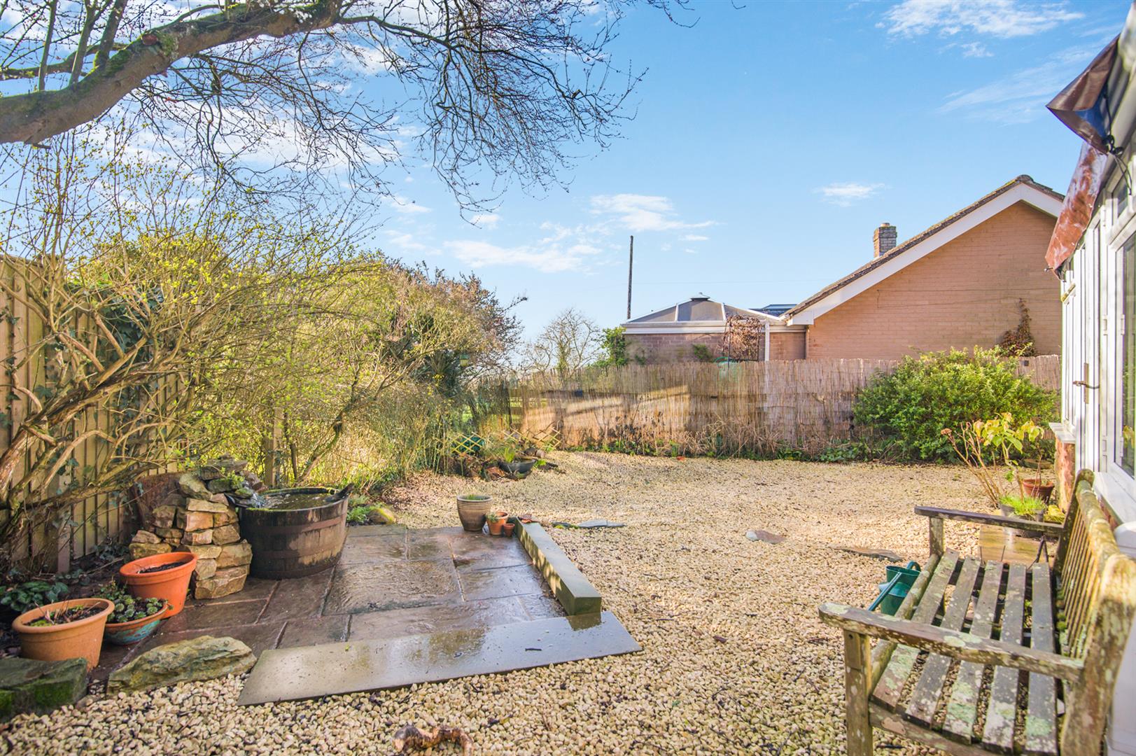 The rear garden has been landscaped for easy maintenance in Cotswold gravel. Here you will find mature flower borders, a seating area and a water fall feature. It is an ideal spot for relaxing in and for entertaining in the evening sun. There is also a storage area for the oil tank.