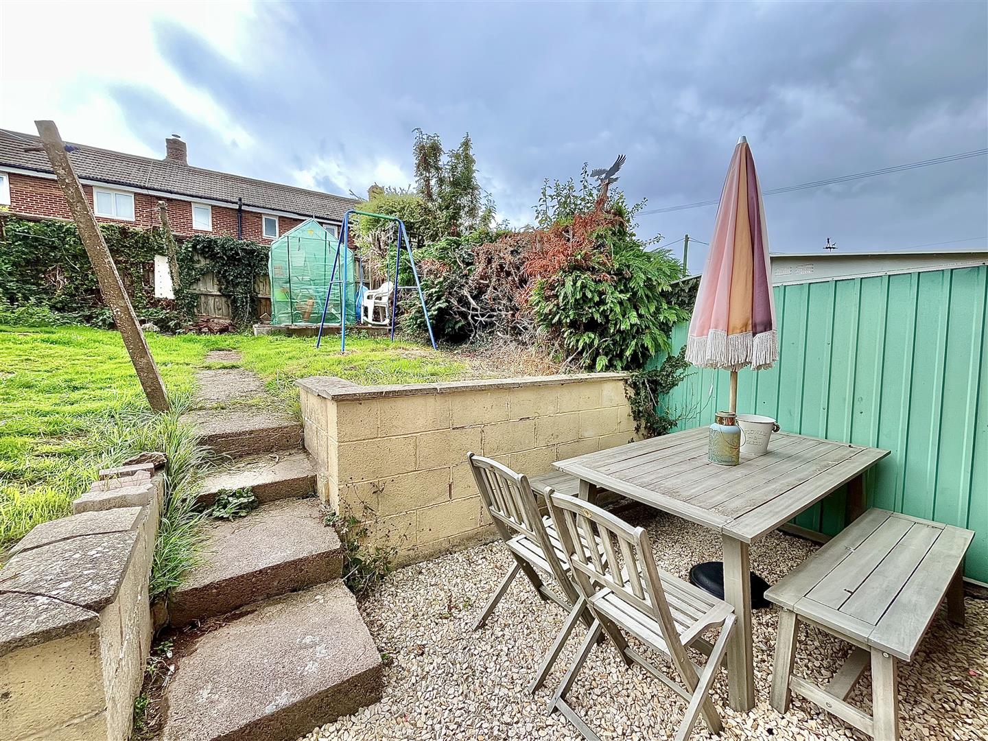 Outside - A gate and steps lead to the canopied front entrance. The south-facing enclosed rear garden comprises a lower patio and a lawn.