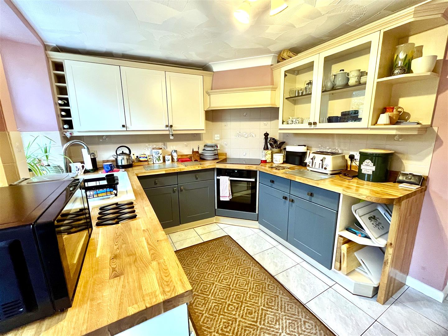 Kitchen - 3.71m x 2.59m (12'2" x 8'6") - A range of fitted eye and base level units with wood worktops and ceramic sink unit, built in electric oven with Neff induction hob and extractor over, space for a fridge/freezer, plumbing for washing machine, Worcester oil-fired combi boiler, tiled splashbacks and flooring, window and part glazed upvc door to the rear aspect looking into and giving access to the southerly facing courtyard garden.