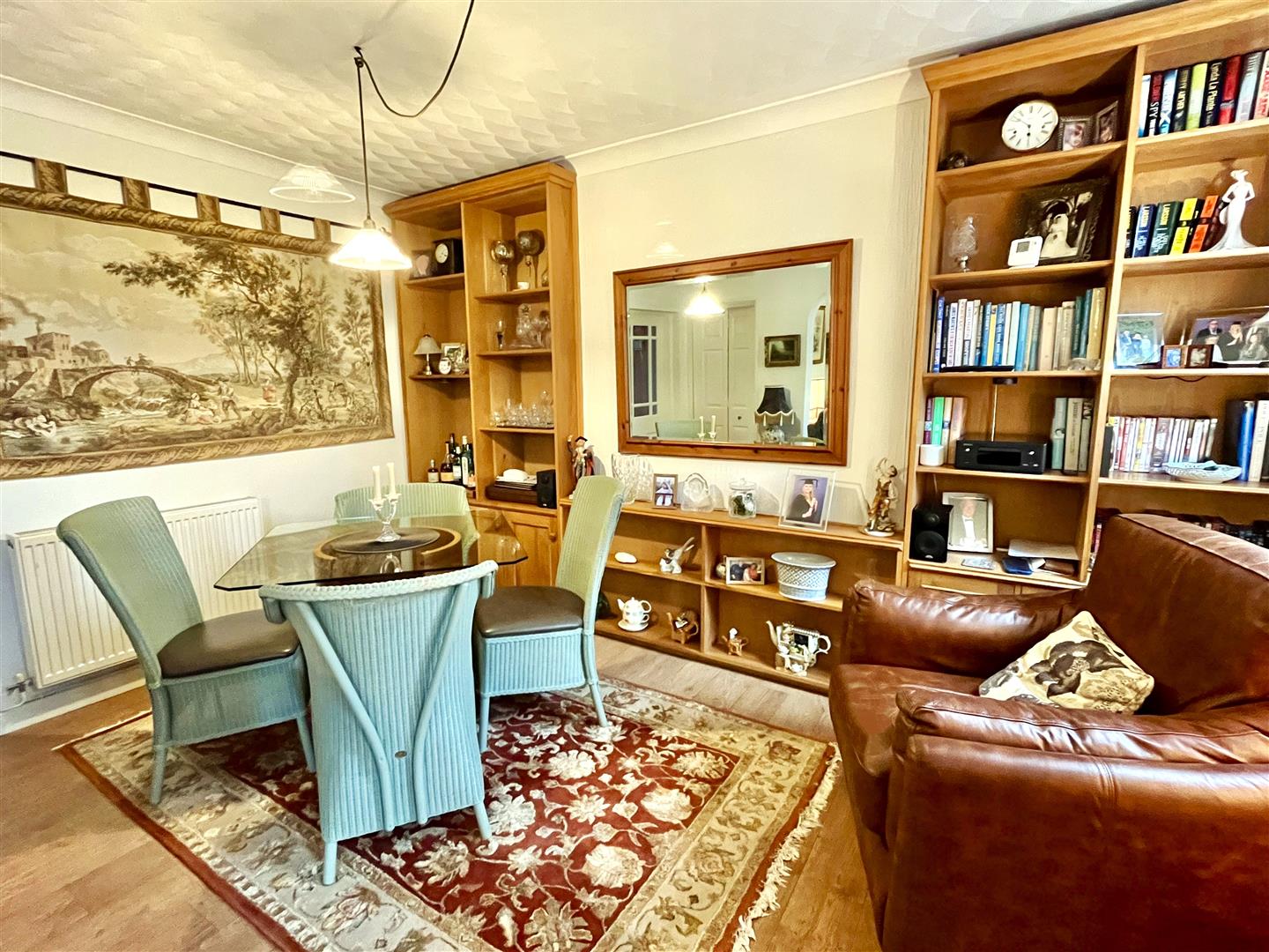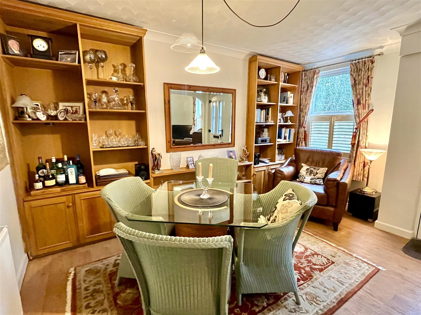 Dining Room - 4.27m x 3.43m (14'0" x 11'3") - Built in storage and display units, wood effect flooring, window with fitted slatted blinds to the front aspect. An archway opening leads to the adjacent sitting room, doors lead off to the kitchen and bathroom.