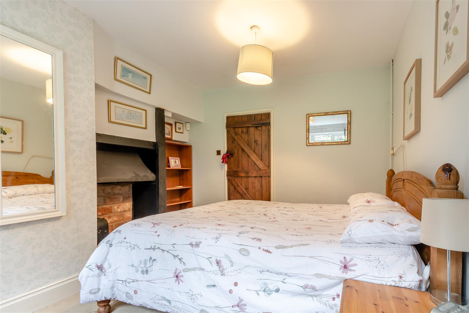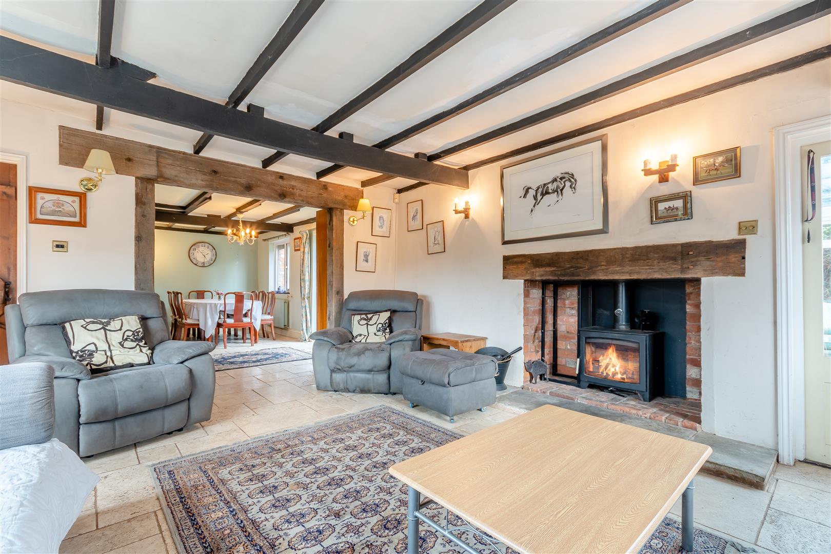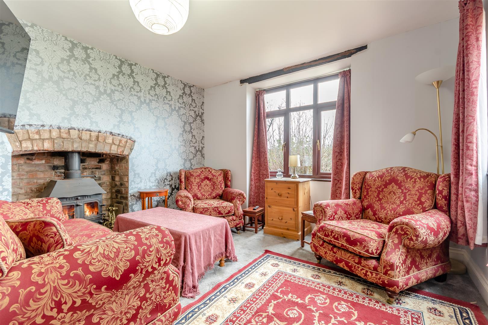 Drawing Room - 5.21m x 4.34m (17'1 x 14'3) - Lovely open fireplace with raised brick and stone hearth, solid wood beam over, inset wood burning stove, tiled flooring, double radiator, beamed ceiling, side and front aspect windows, fully glazed doors through to the front with a lovely outlook over surrounding fields and farmland. Fully glazed doors through to: