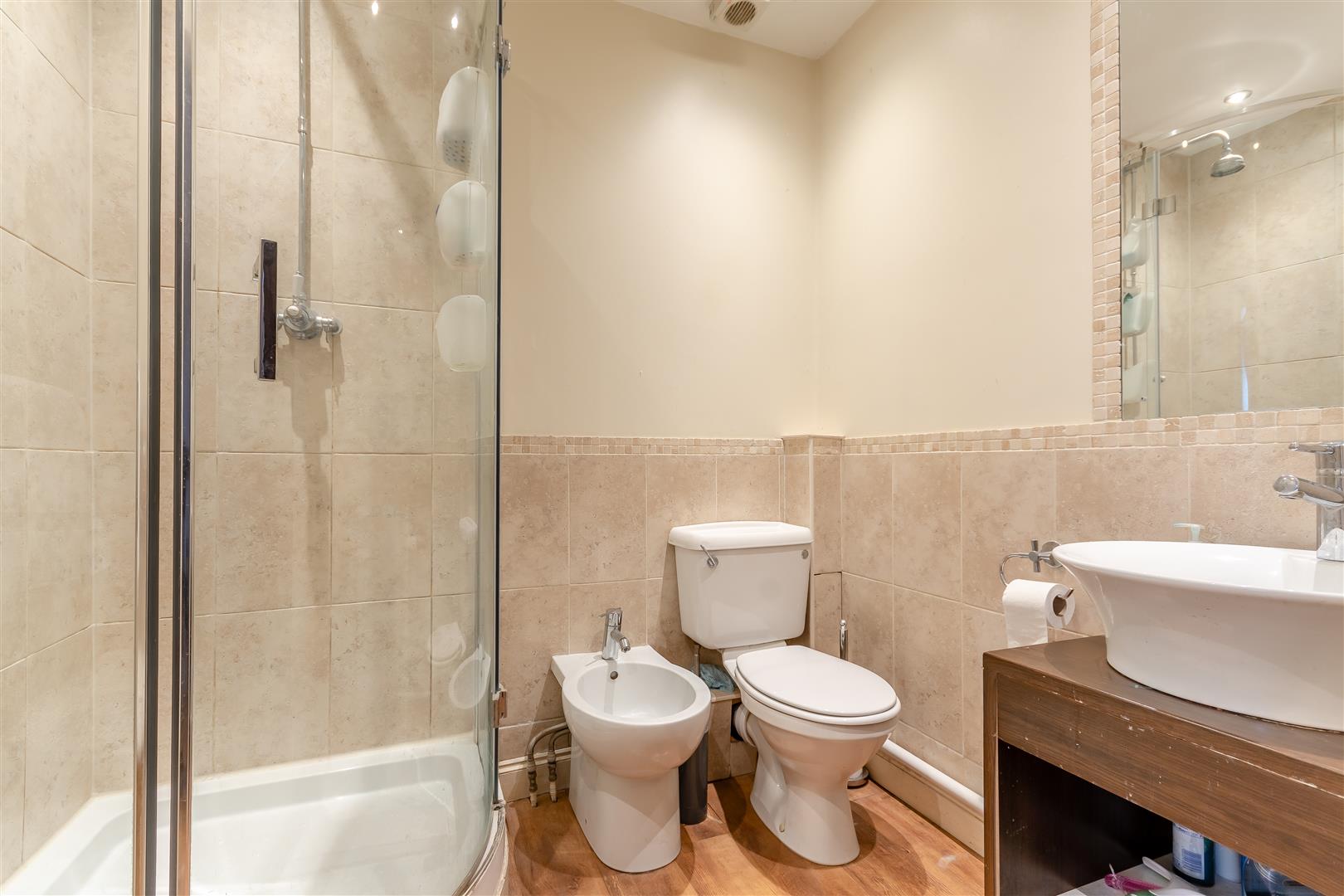 Shower Room - Fitted shower cubicle and tray, shower over, bidet, close coupled WC, wash hand basin, wall mirror, radiator, extractor fan.