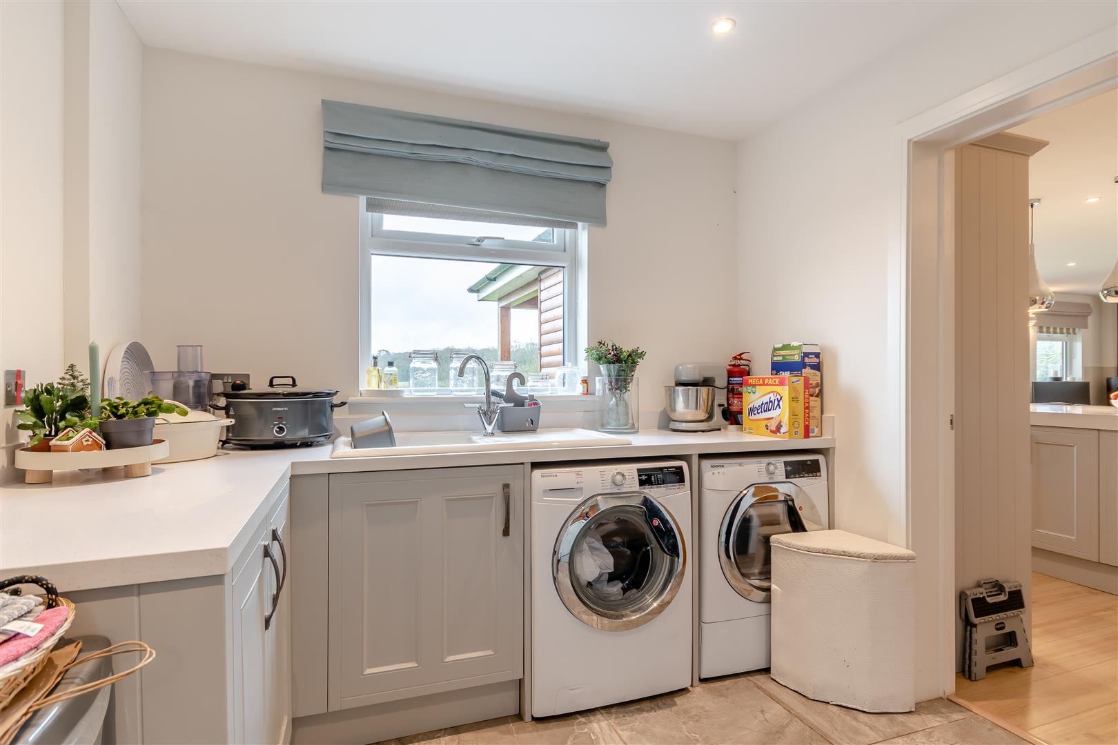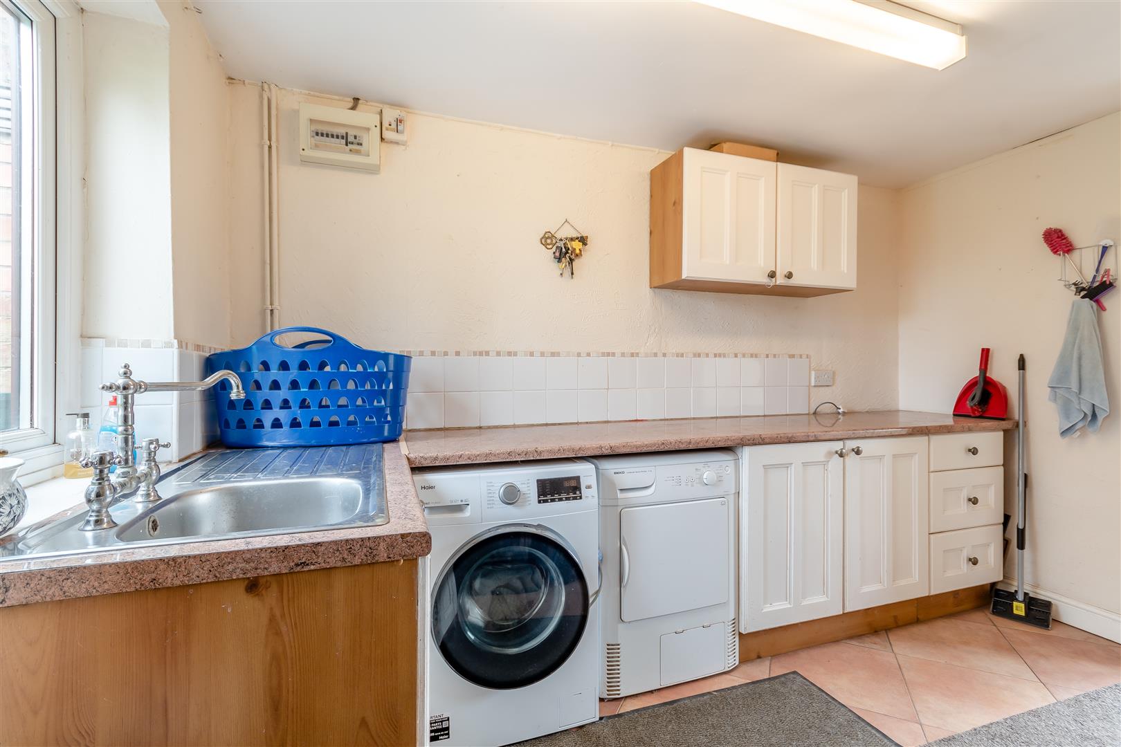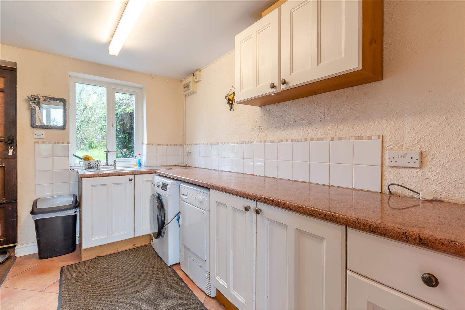 Utility - 3.02m x 2.59m (9'11 x 8'6) - Single drainer sink unit with mixer tap, cupboard under, fitted base units, plumbing for washing machine, space for tumble dryer, tiled flooring, radiator, side aspect window with stunning views over open countryside, part glazed door through to a small rear courtyard.