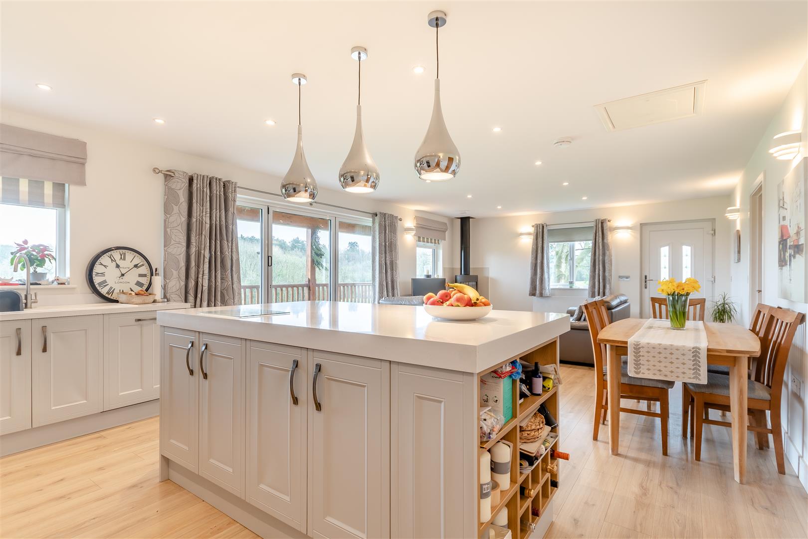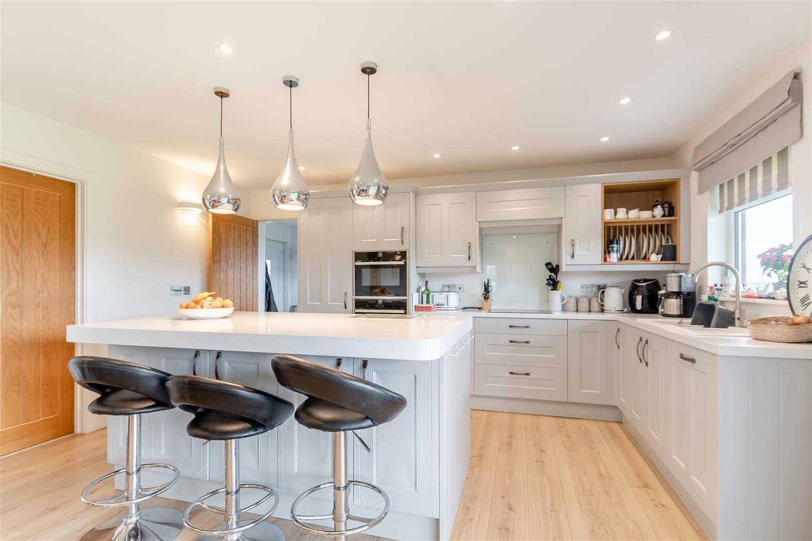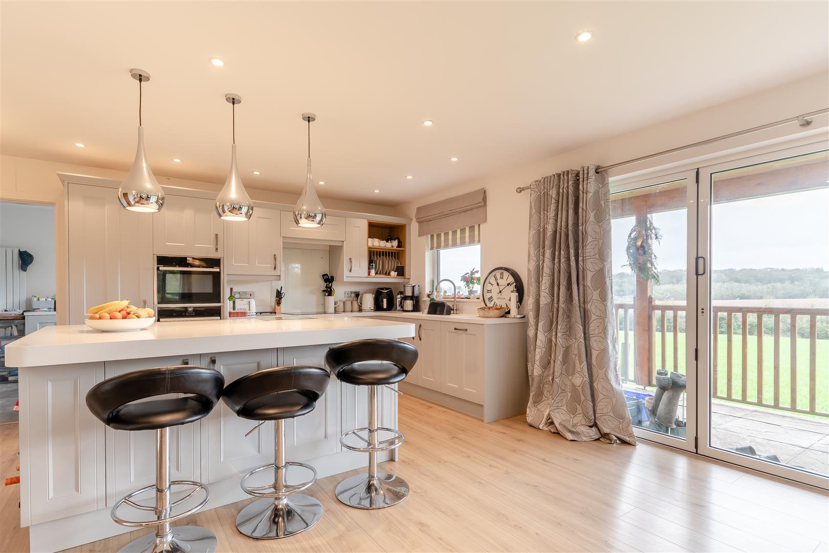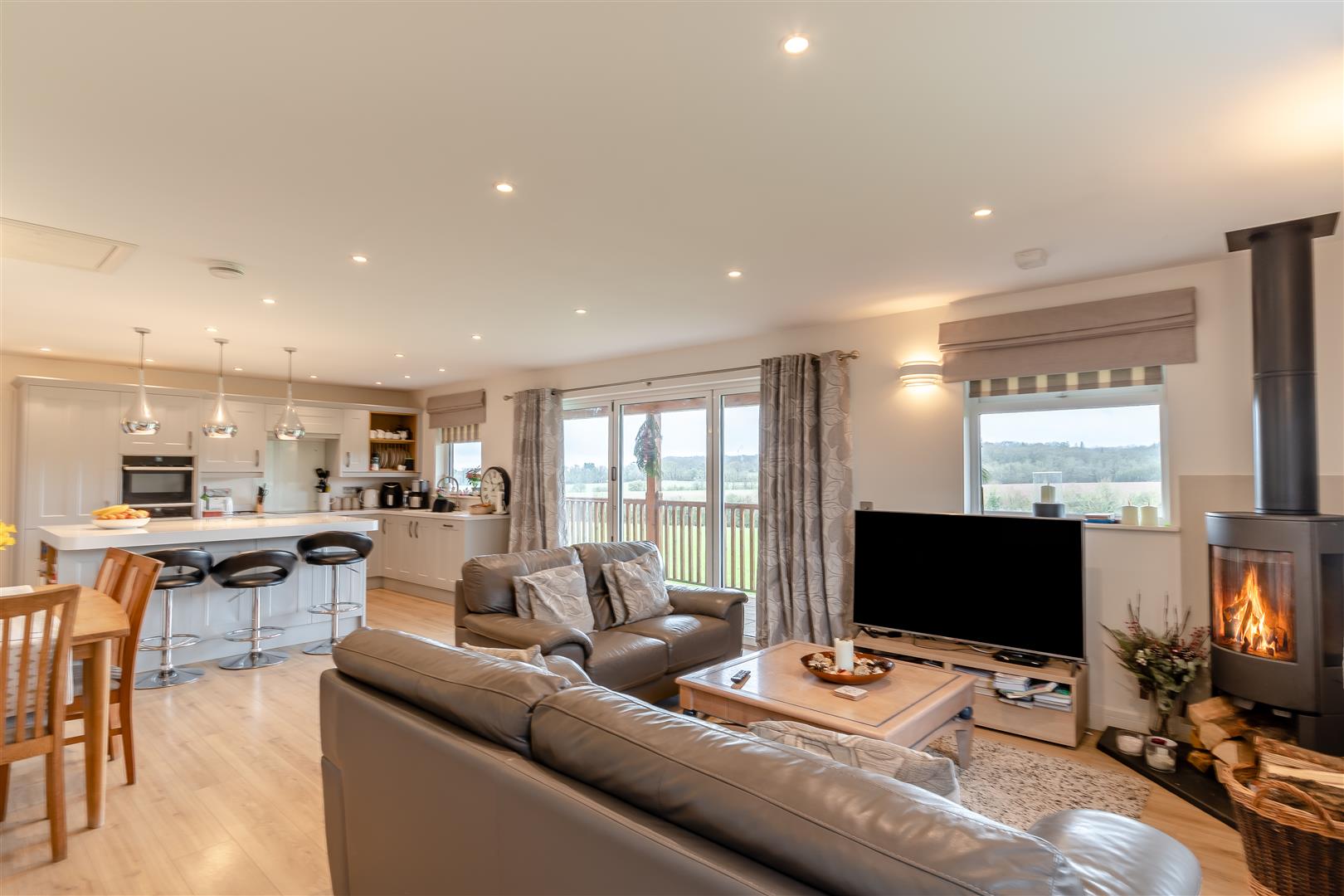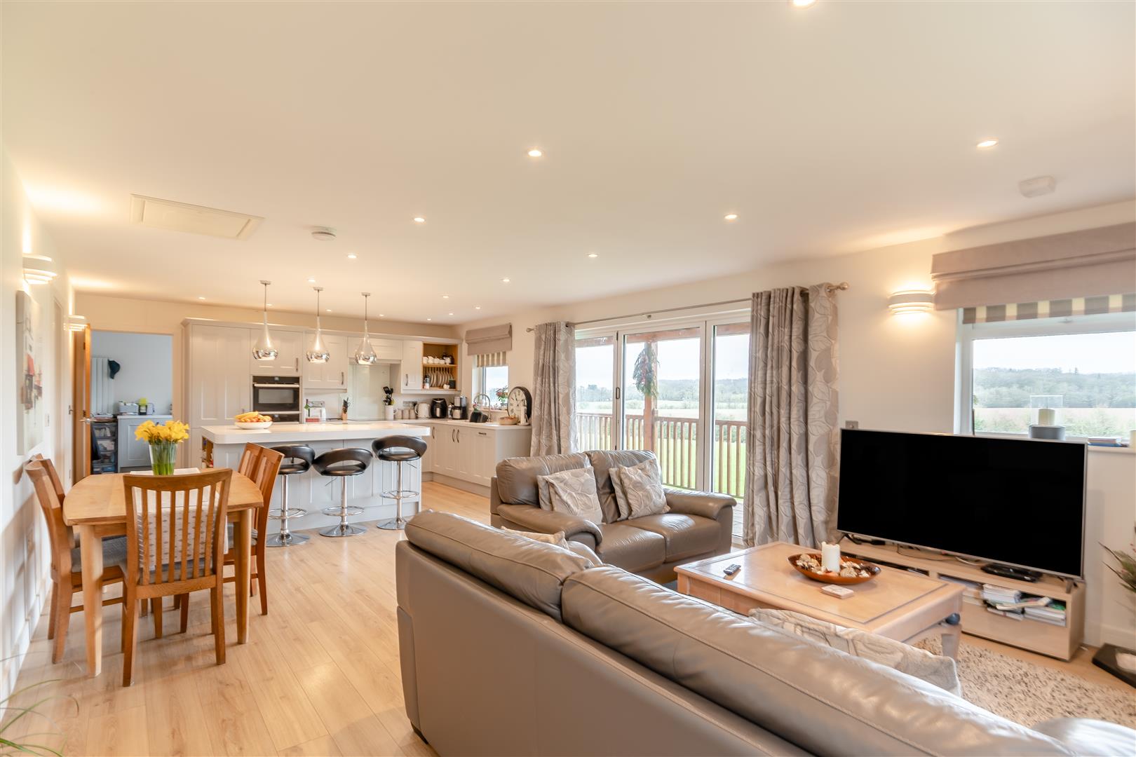 Living Room / Kitchen - 8.61m x 4.62m overall (28'3 x 15'2 overall) - Fitted kitchen to comprise one and a half bowl single drainer sink unit with mixer tap, cupboards under, range of base and wall mounted units, integrated dishwasher, hob with cooker hood above, electric double oven with microwave, integrated fridge / freezer, large breakfast island with cupboards under, under floor heating plus electric panel heating if required, access to roof space, front and side aspect windows. Large bi-fold doors lead out to the verandah which gives exceptional views over the surrounding fields and countryside.