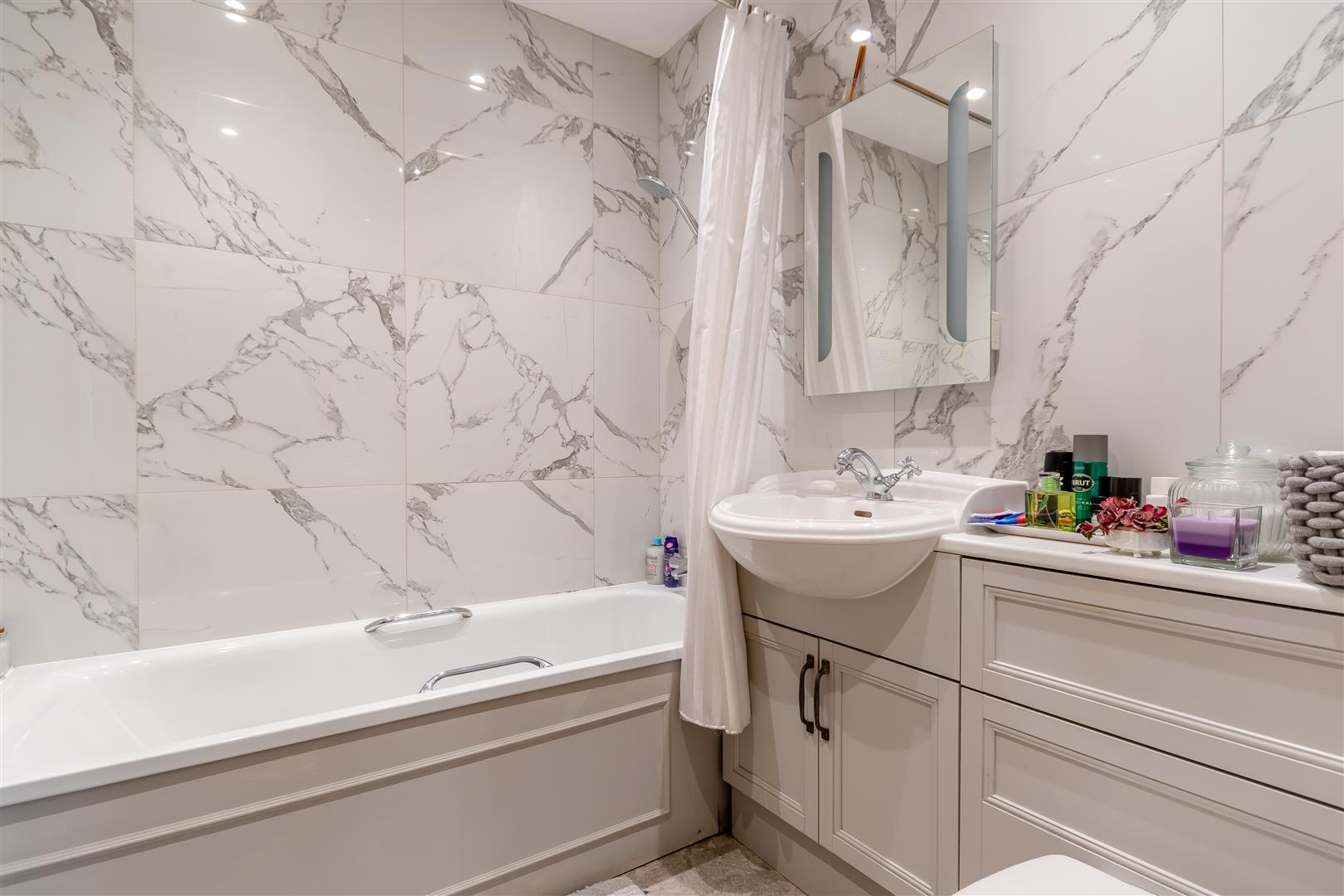 En-Suite Bathroom - White suite comprising modern panelled bath with shower attachment over, tiled surround, vanity wash hand basin, cupboards below, close coupled WC, mirror faced cabinet, heated towel rail, tiled flooring.