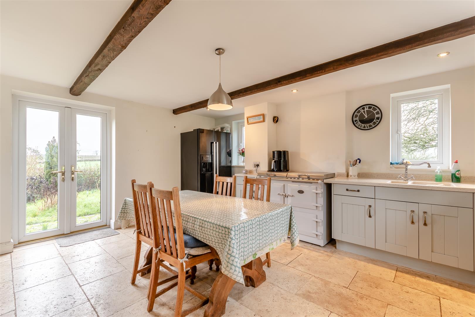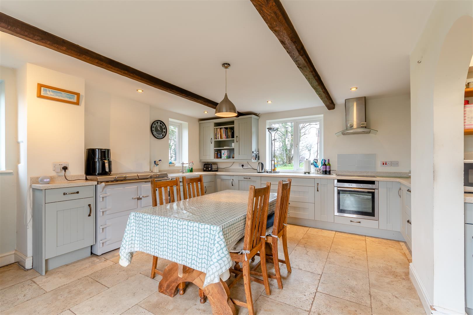 Kitchen - 4.88m x 4.50m (16'0 x 14'9) - Fitted kitchen to comprise one and a half bowl single drainer sink unit with mixer tap, cupboards under, range of base and wall mounted units, integrated dishwasher, oven, hob, cooker hood above, fitted electric Everhot cooking range with ovens and hotplate, space for American fridge / freezer, tiled flooring, exposed timbers, spotlighting, side and rear aspect windows with a lovely private outlook over the gardens and grounds with views beyond. Fully glazed French doors with lovely countryside views.
