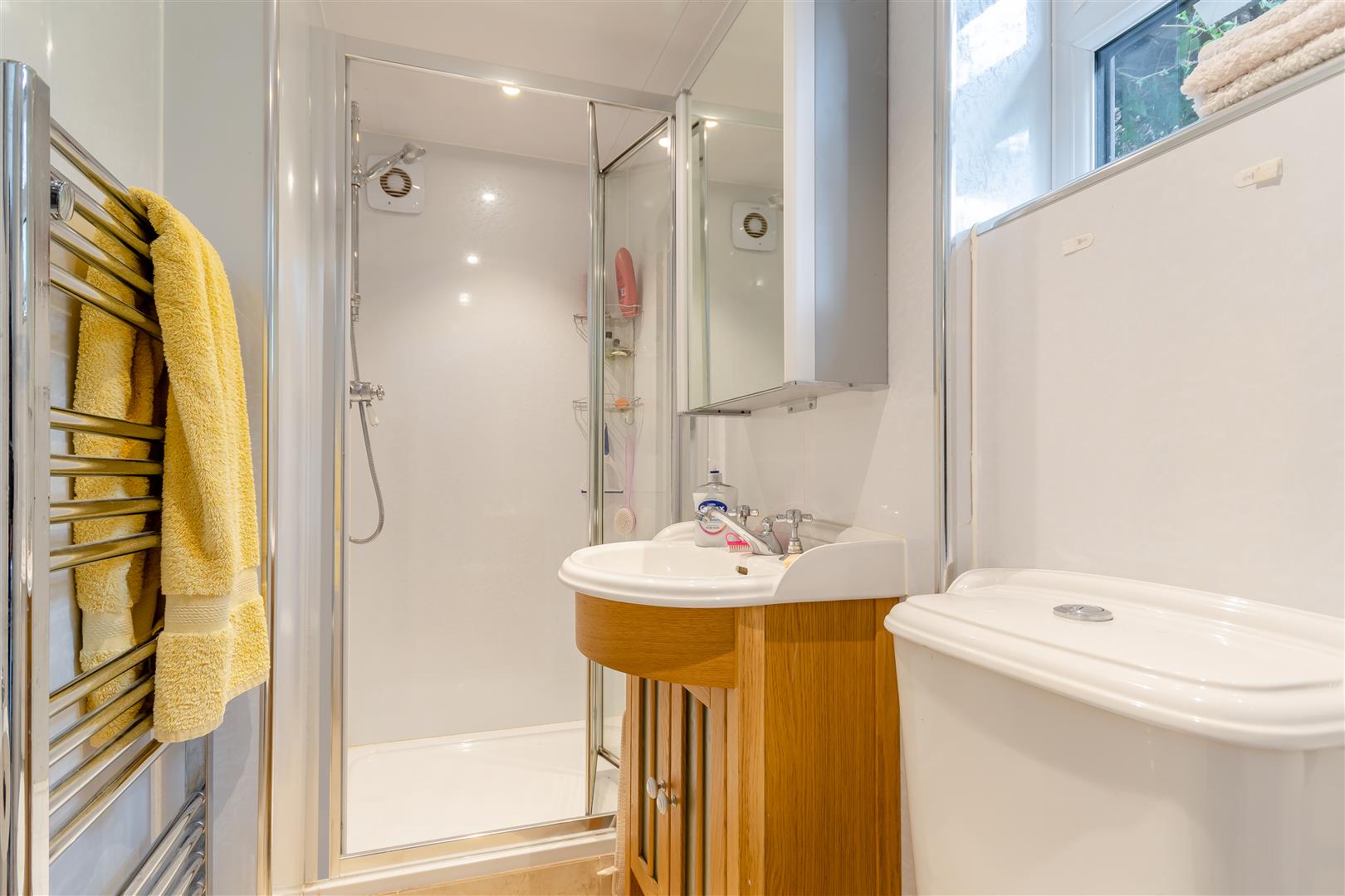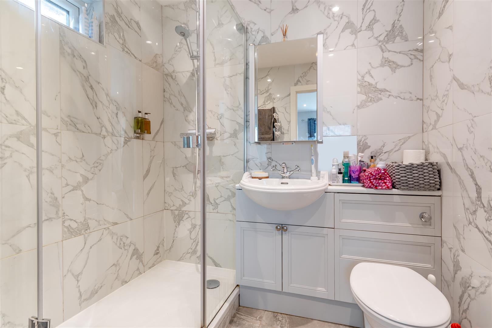 En-Suite Shower Room - Fitted double shower cubicle and tray, shower, tiled surround, vanity wash hand basin with cupboards below, mirror faced medicine cabinet over, close coupled WC, heated towel rail, tiled flooring.