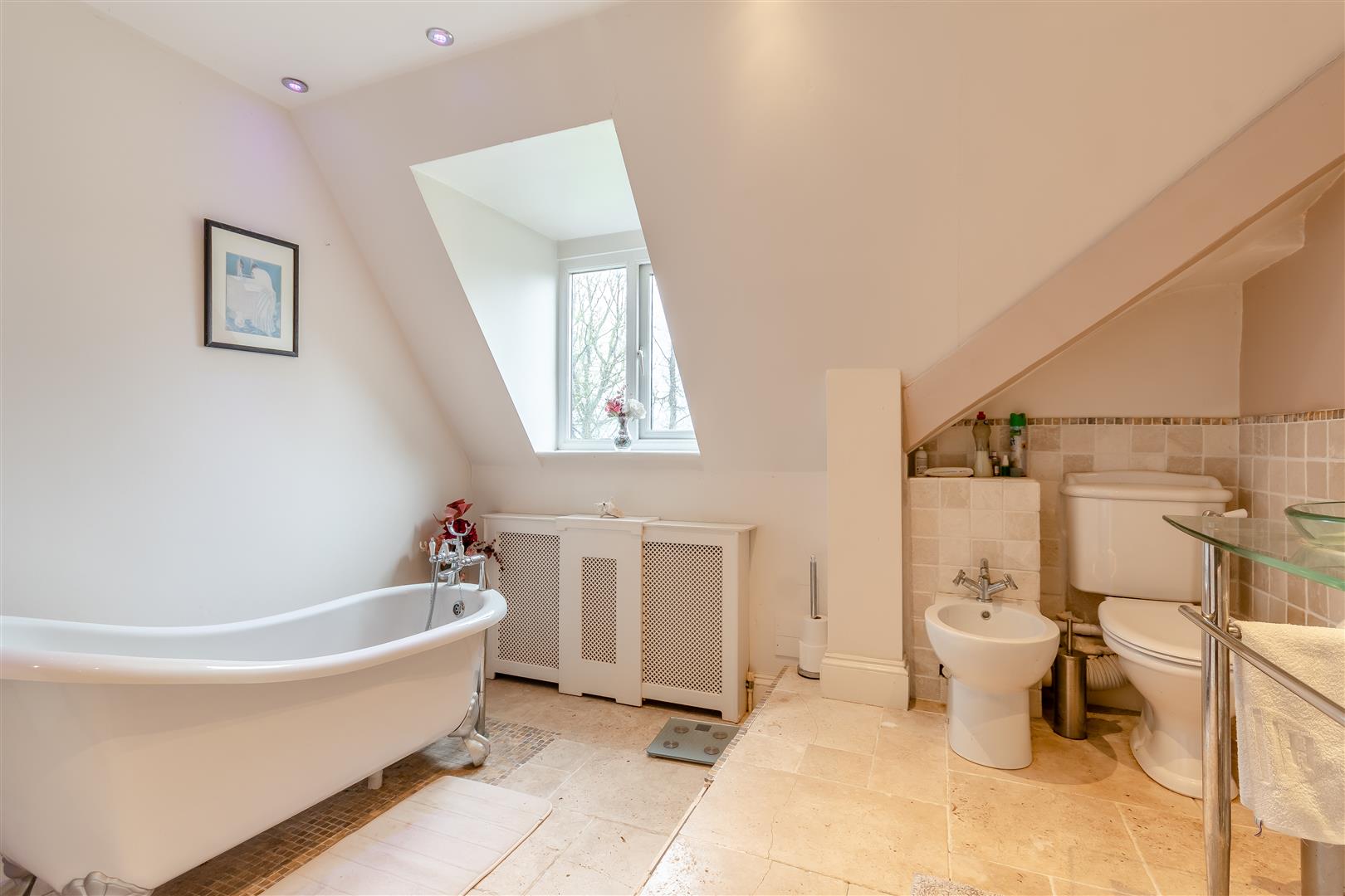 Bathroom - 3.25m x 2.77m (10'8 x 9'1) - Slipper bath with shower attachment, bidet, close coupled WC, wash hand basin, radiator, spotlighting, tiled flooring, rear aspect window with superb views.