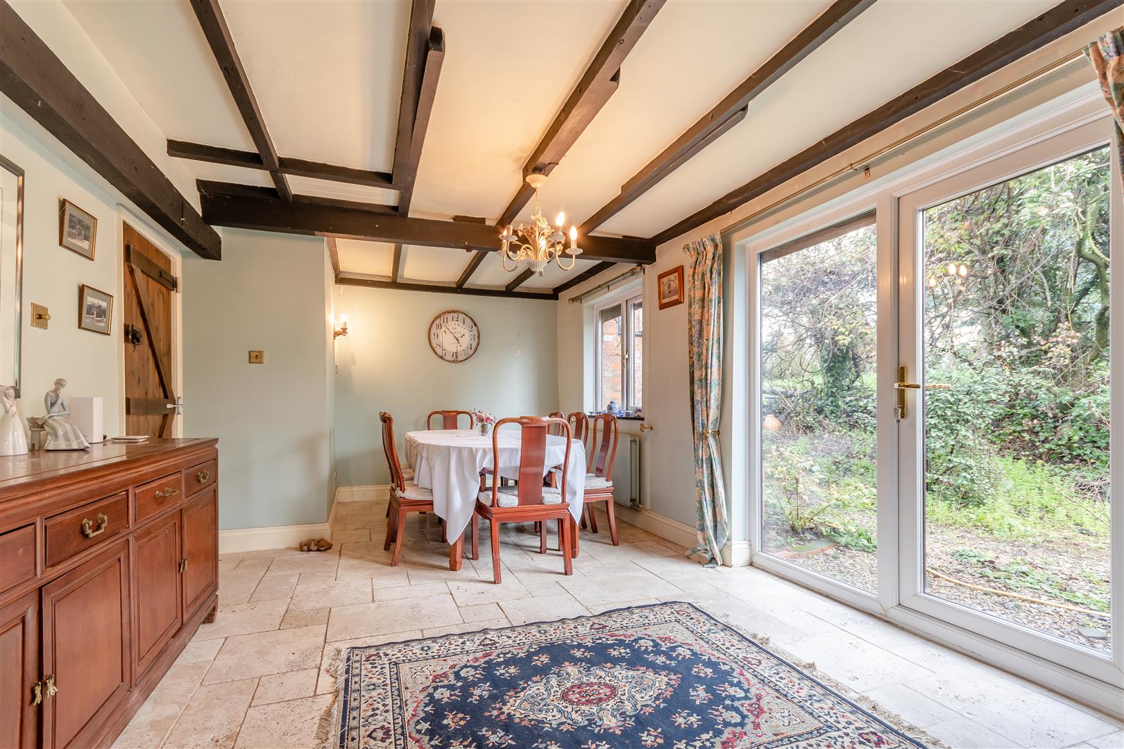 Dining Room - 5.51m x 3.38m (18'1 x 11'1) - Tiled flooring, double radiator, exposed beams, rear aspect window, fully glazed French doors through to the rear garden.