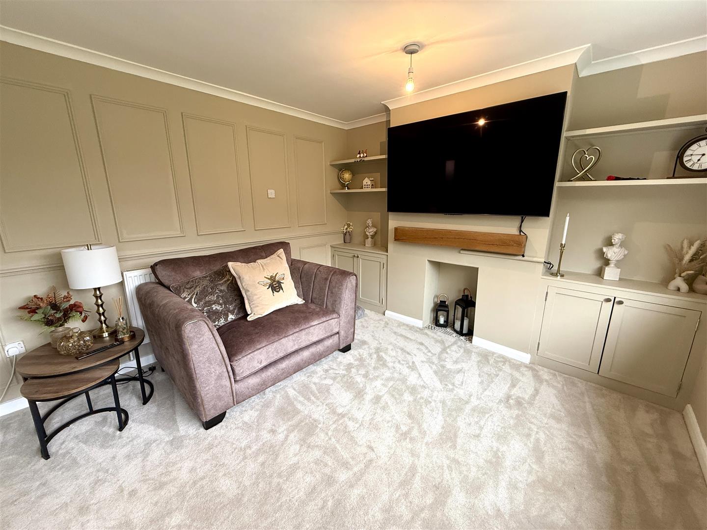 Living Room - 4.88m x 3.35m (16'0 x 11'0) - Open fireplace (which could be opened up) with solid wood beam over, built-in display cabinets to either side with shelving over, double radiator, front aspect window with outlook over the gardens.