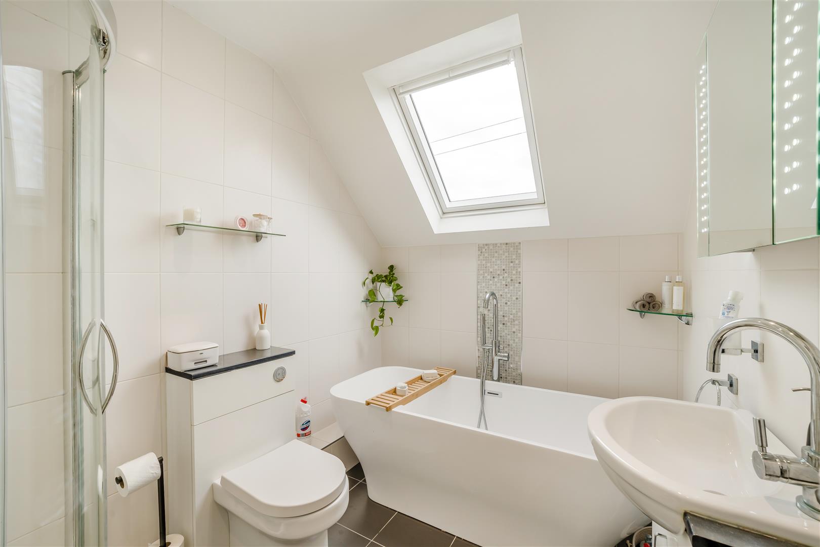 Family Bathroom - 2.57m x 1.93m (8'05 x 6'04) - White suite comprising bath with raised shower mixer tap, corner shower cubicle with overhead detachable hand shower, built-in wc and vanity wash hand basin, cupboards below, tiled floor, tiled walls, chrome heated towel rail, extractor fan, spotlighting, rear aspect velux roof light.