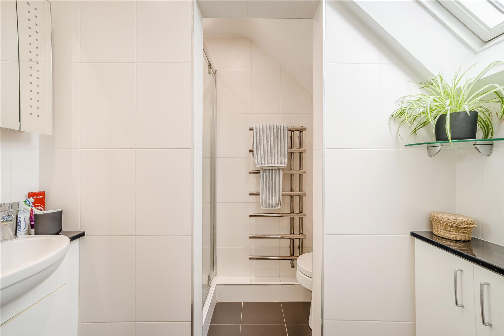 En-Suite Shower Room - 2.03m x 1.68m (6'08 x 5'06) - Glazed door to shower cubicle with overhead and detachable hand shower, vanity wash hand basin, mixer tap, cupboard below, wc, chrome heated towel rail, tiled floor, fully tiled walls, rear aspect velux roof light.
