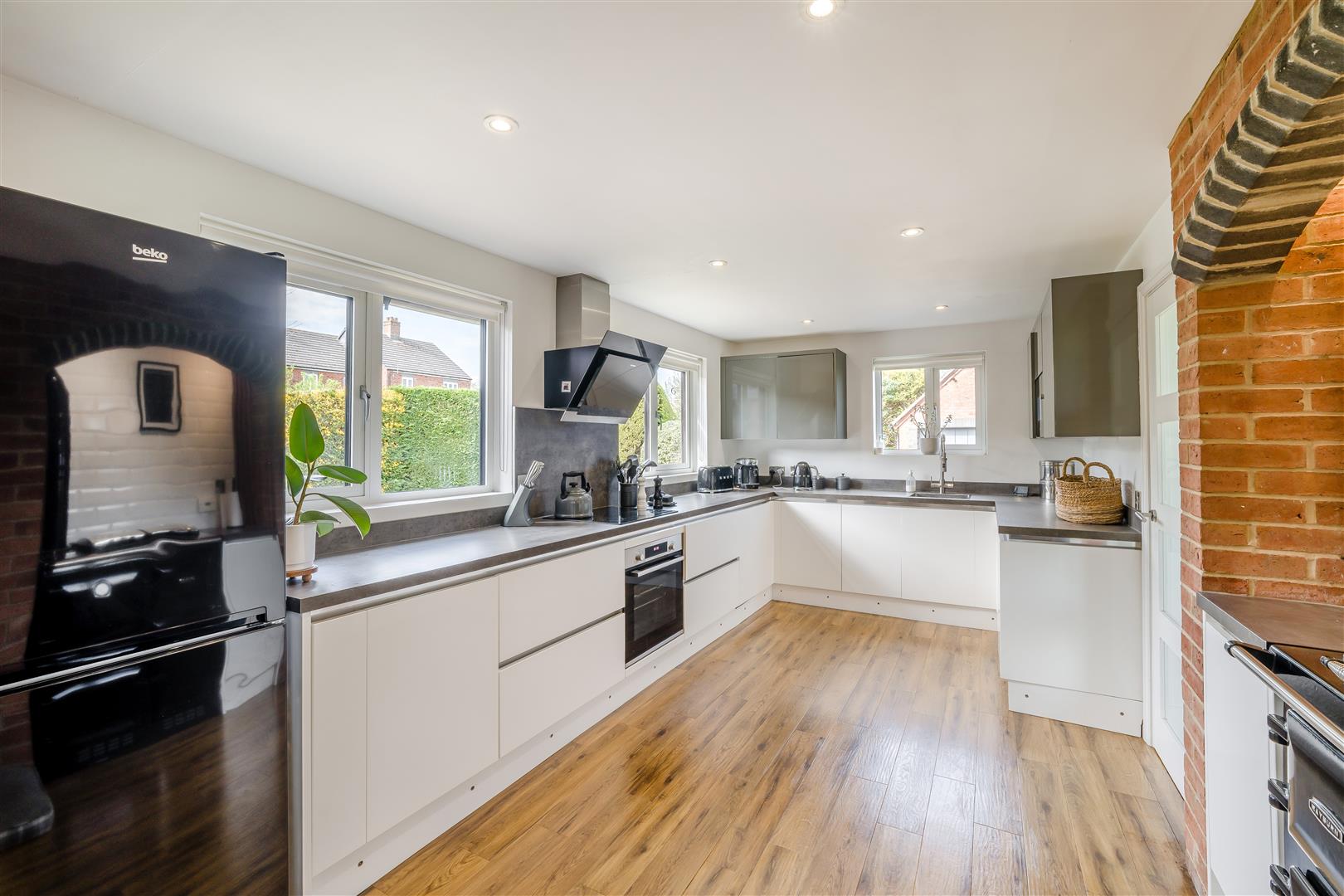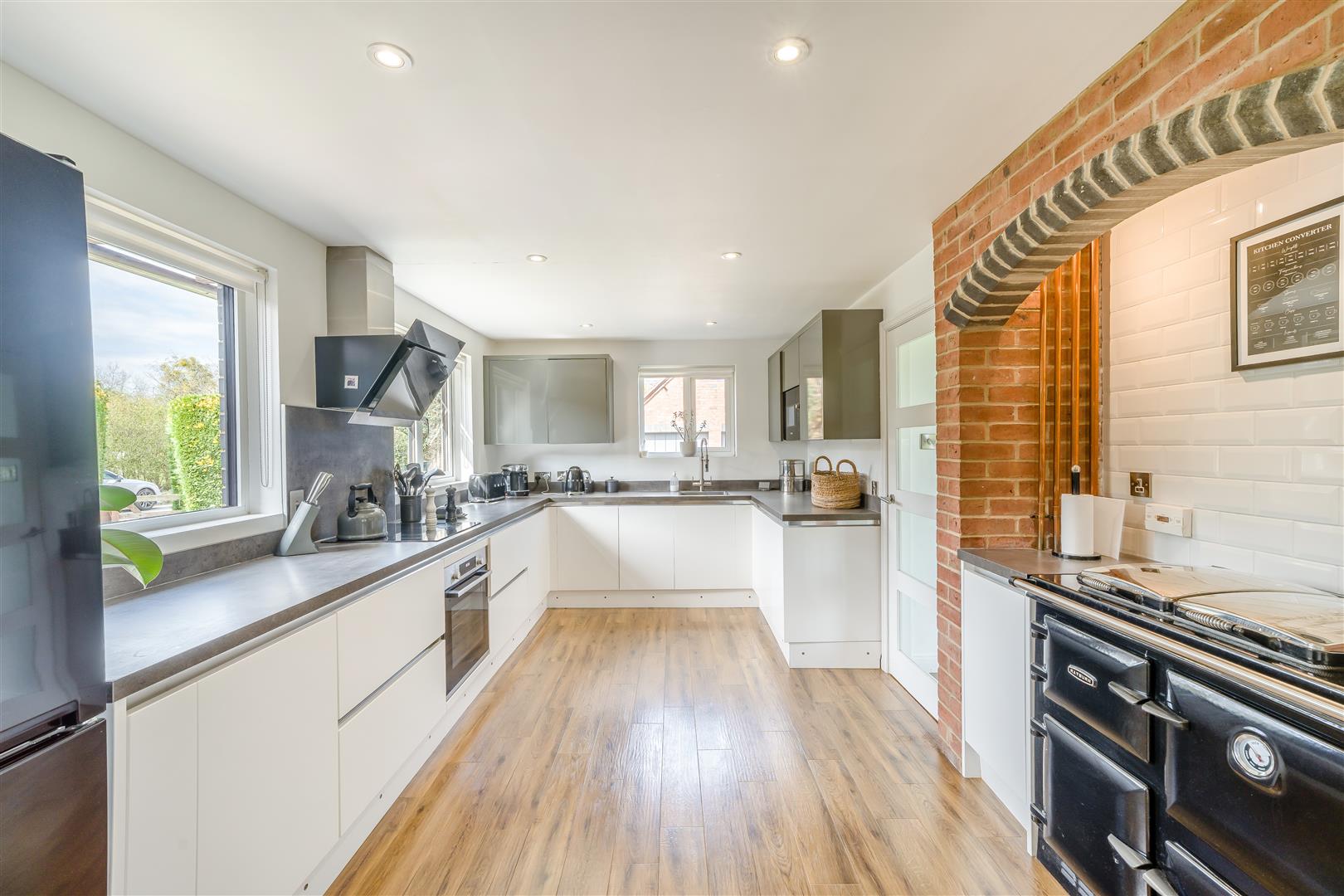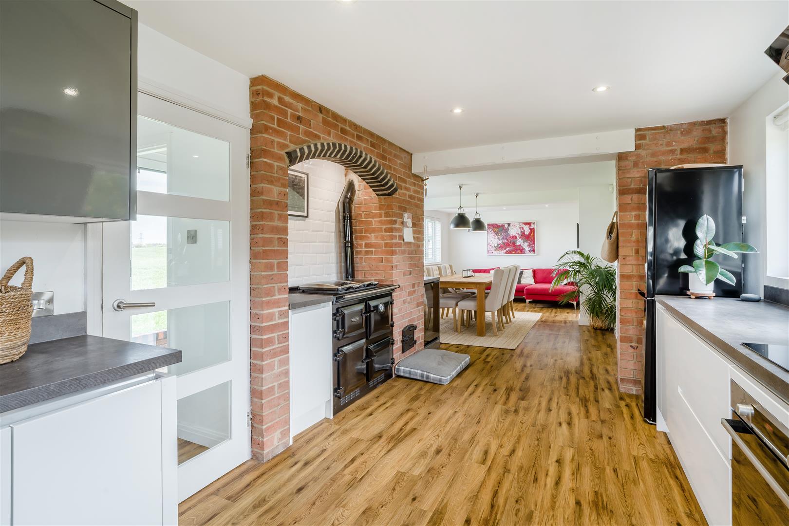 Kitchen / Dining / Family Room - 11.30m x 3.86m maximum (37'01 x 12'08 maximum) - Kitchen area: Range of base and wall mounted units, laminated worktops and splashbacks, stainless steel sink with mixer tap, Bosch oven with four ring induction hob, extractor fan over, space for American fridge/freezer, oil fired Rayburn supplying central heating and hot water with exposed arched brick surround, low level unit lighting, integrated appliances to include Bosch dishwasher and microwave, inset spotlighting, front and side aspect windows.