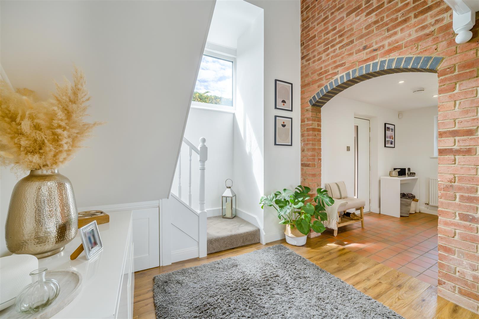 Inner Hallway - Vaulted ceiling, exposed brickwork, under stairs storage, turning staircase to the first floor, inset spotlighting, front aspect picture window. Glazed door through to: