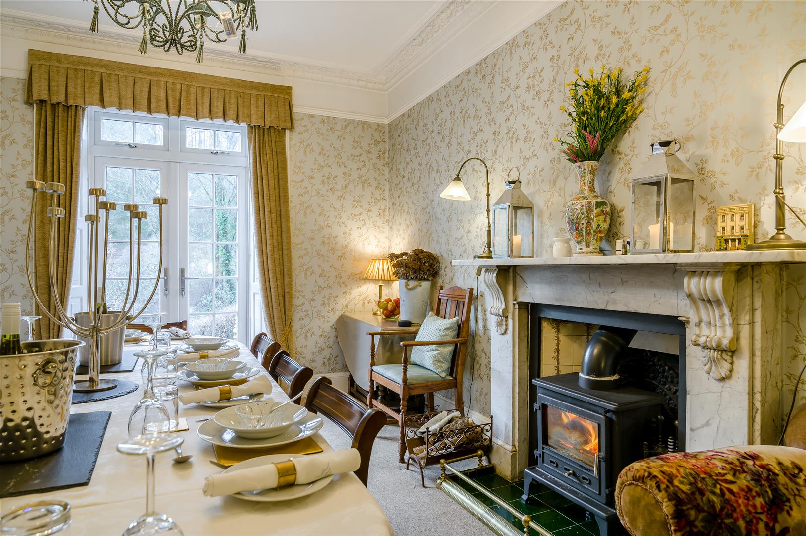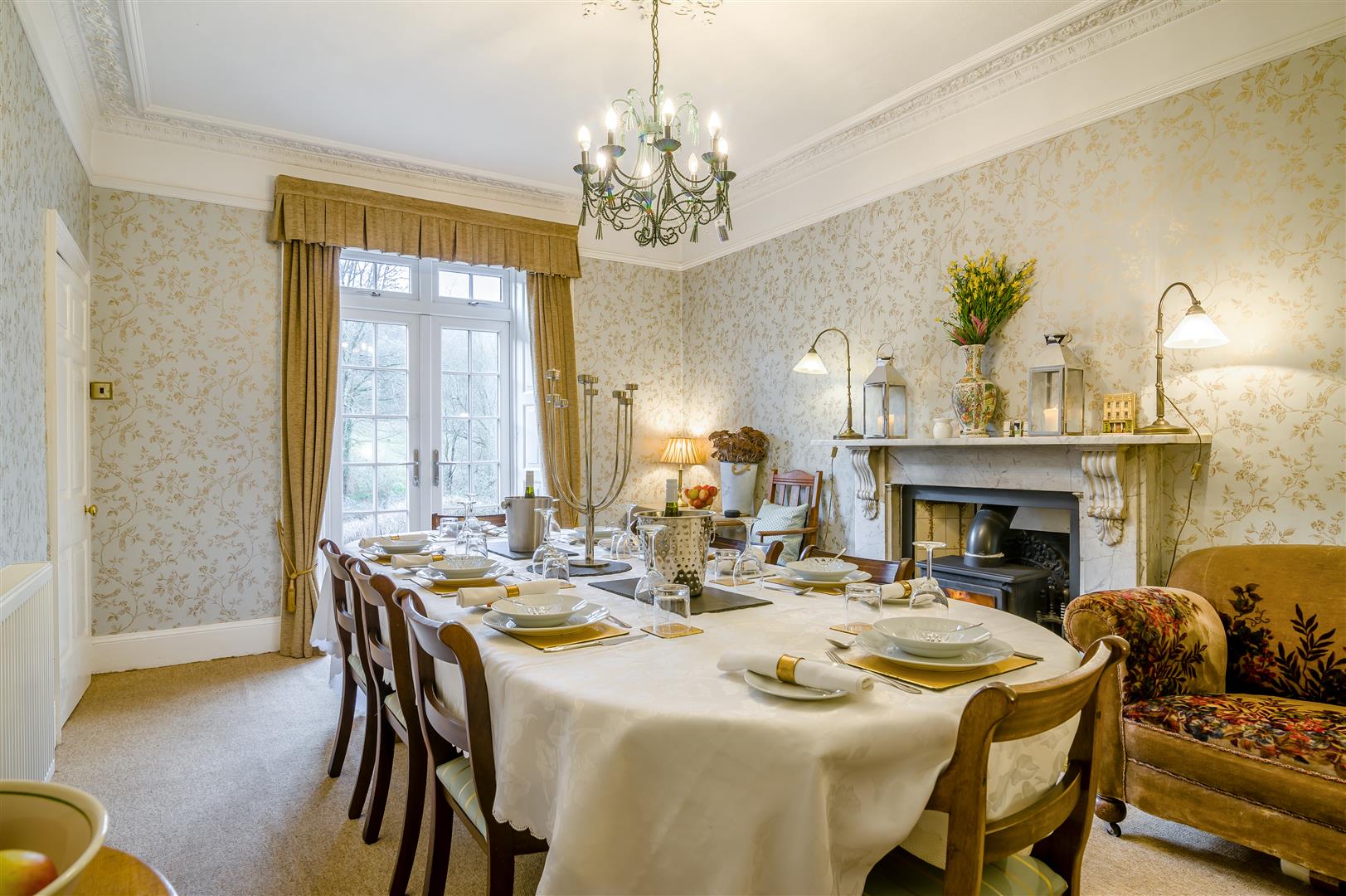 Dining Room - 5.13m x 3.58m (16'10 x 11'09) - An elegant room with an open fireplace set within decorative tiling and a marble surround. The dining room is large enough for lavish dinner parties or for feeding guests breakfast before they set off along the Offa's Dyke.
