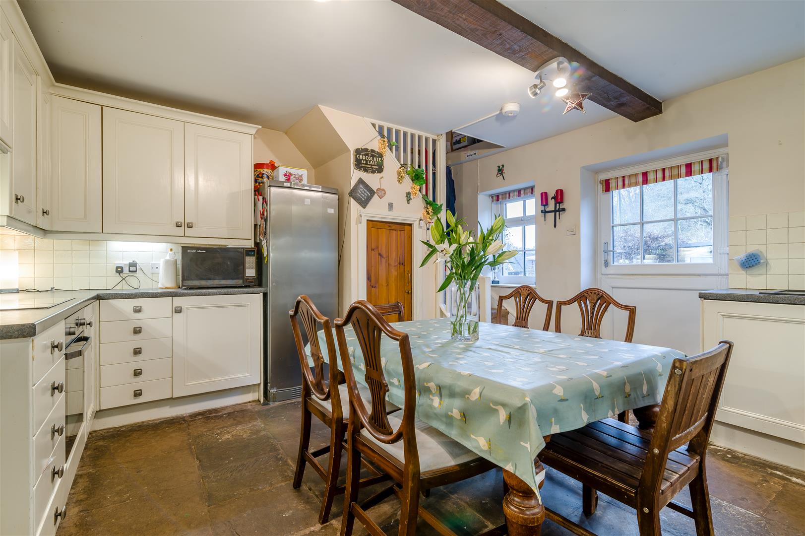 Kitchen - 4.22m x 4.70m (13'10 x 15'05) - The heart of the home, this warm and inviting kitchen is fitted with quality units and an AGA, complemented by flagstone flooring and exposed beams that reinforce the property's period charm. There is ample space for a family dining table, making it a natural hub for everyday living and entertaining. A stable door provides access to the outside, while a secondary staircase rises from the kitchen to Bedroom Three, offering an additional and highly practical route to the first floor and enhancing the home's flexible layout. There is also a staircase which leads down to the Cellars.